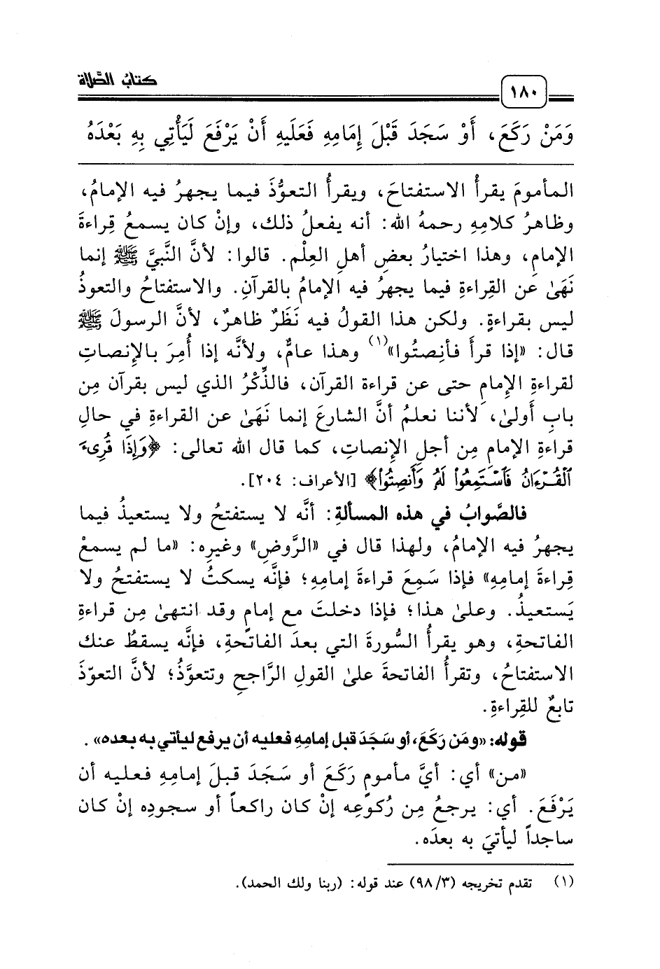 المأمومَ يقرأْ الاستفتاحَ، ويقرأُ التعوُّذَ فيما يجهرُ فيه الإمامُ، وظاهرُ كلامِهِ رحمه الله: أنه يفعلُ ذلك، وإنْ كان يسمعُ قِراءةَ الإمامِ، وهذا اختيارُ بعضِ أهلِ العِلْم. قالوا: لأنَّ النَّبيَّ صلّى الله عليه وسلّم إنما نَهَى عن القِراءةِ فيما يجهرُ فيه الإمامُ بالقرآنِ. والاستفتاحُ والتعوذُ ليس بقراءةٍ. ولكن هذا القولُ فيه نَظَرٌ ظاهرٌ، لأنَّ الرسولَ صلّى الله عليه وسلّم قال: «إذا قرأَ فأنِصتُوا» (¬1) وهذا عامٌّ، ولأنَّه إذا أُمِرَ بالإِنصاتِ لقراءةِ الإِمامِ حتى عن قراءة القرآن، فالذِّكْرُ الذي ليس بقرآن مِن بابِ أَولى، لأننا نعلمُ أنَّ الشارعَ إنما نَهَى عن القراءةِ في حالِ قراءةِ الإمامِ مِن أجلِ الإِنصاتِ، كما قال الله تعالى: {وَإِذَا قُرِىءَ الْقُرْآنُ فَاسْتَمِعُوا لَهُ وَأَنْصِتُوا} [الأعراف: 204].
