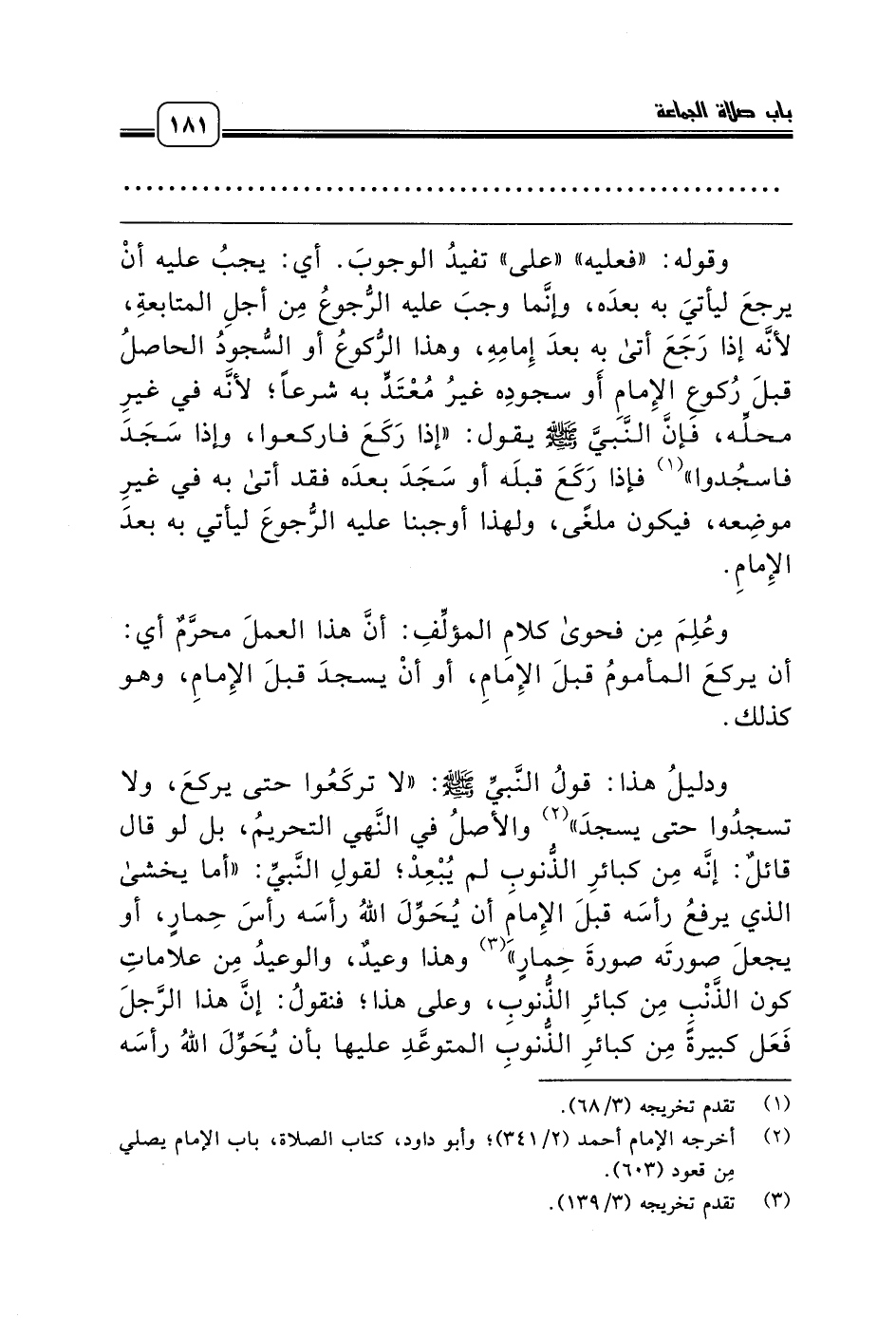 ودليلُ هذا: قولُ النَّبيِّ صلّى الله عليه وسلّم: «لا تركَعُوا حتى يركعَ، ولا تسجدُوا حتى يسجدَ» (¬2) والأصلُ في النَّهي التحريمُ، بل لو قال قائلٌ: إنَّه مِن كبائرِ الذُّنوبِ لم يُبْعِدْ؛ لقولِ النَّبيِّ: «أما يخشى الذي يرفعُ رأسَه قبلَ الإِمامِ أن يُحَوِّلَ اللهُ رأسَه رأسَ حِمارٍ، أو يجعلَ صورتَه صورةَ حِمارٍ» (¬3) وهذا وعيدٌ، والوعيدُ مِن علاماتِ كون الذَّنْبِ مِن كبائرِ الذُّنوبِ، وعلى هذا؛ فنقولُ: إنَّ هذا الرَّجلَ فَعَل كبيرةً مِن كبائرِ الذُّنوبِ المتوعَّدِ عليها بأن يُحَوِّلَ اللهُ رأسَه