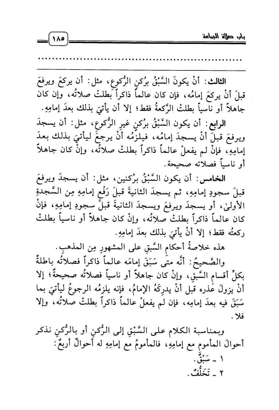 الرابع: أن يكون السَّبْقُ برُكنٍ غيرِ الرُّكوعِ، مثل: أن يسجدَ ويرفعَ قبلَ أنْ يسجدَ إمامُه، فيلزمُه أنْ يرجعَ ليأتيَ بذلك بعدَ إمامِهِ، فإنْ لم يفعلْ عالماً ذاكراً بطلتْ صلاتُه، وإنْ كان جاهلاً أو ناسياً فصلاته صحيحة.