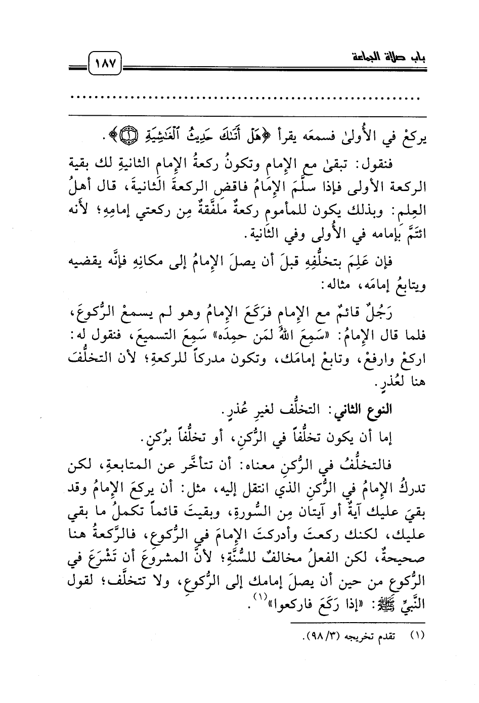 فالتخلُّفُ في الرُّكنِ معناه: أن تتأخَّر عن المتابعةِ، لكن تدركُ الإِمامُ في الرُّكنِ الذي انتقل إليه، مثل: أن يركعَ الإِمامُ وقد بقيَ عليك آيةٌ أو آيتان مِن السُّورةِ، وبقيتَ قائماً تكملُ ما بقي عليك، لكنك ركعتَ وأدركتَ الإِمامَ في الرُّكوعِ، فالرَّكعةُ هنا صحيحةٌ، لكن الفعلُ مخالفٌ للسُّنَّةِ؛ لأنَّ المشروعَ أن تَشْرَعَ في الرُّكوعِ من حين أن يصلَ إمامك إلى الرُّكوعِ، ولا تتخلَّف؛ لقول النَّبيِّ صلّى الله عليه وسلّم: «إذا رَكَعَ فاركعوا» (¬1).
