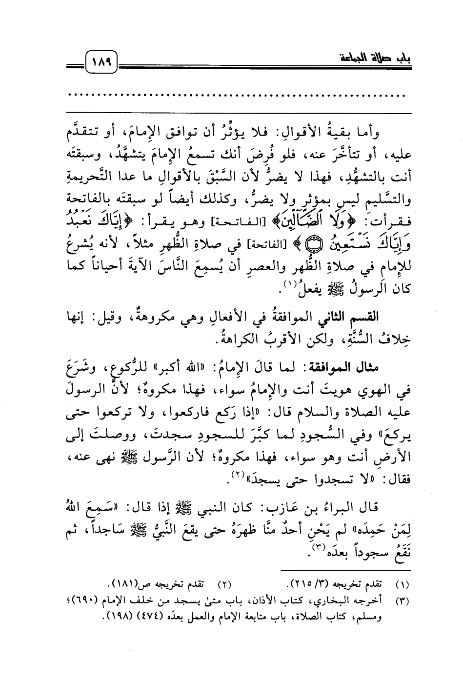 مثال الموافقة: لما قالَ الإِمامُ: «الله أكبر» للرُّكوعِ، وشَرَعَ في الهوي هويتَ أنت والإِمامُ سواء، فهذا مكروهٌ؛ لأنَّ الرسولَ عليه الصلاة والسلام قال: «إذا رَكع فاركعوا، ولا تركعوا حتى يركعَ» وفي السُّجودِ لما كبَّرَ للسجودِ سجدتَ، ووصلتَ إلى الأرضِ أنت وهو سواء، فهذا مكروهٌ؛ لأن الرَّسول صلّى الله عليه وسلّم نهى عنه، فقال: «لا تسجدوا حتى يسجدَ» (¬2).