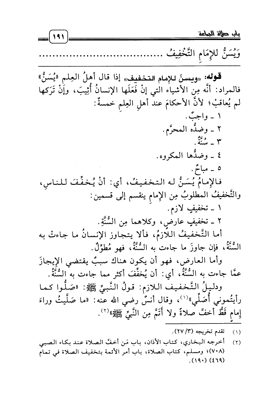 ودليلُ التَّخفيف اللازم: قولُ النَّبيِّ صلّى الله عليه وسلّم: «صَلُّوا كما رأيتُموني أُصَلِّي» (¬1)، وقال أنسٌ رضي الله عنه: «ما صَلَّيتُ وراءَ إِمامٍ قَطُّ أخفَّ صلاةً ولا أَتَمَّ مِن النَّبيِّ صلّى الله عليه وسلّم» (¬2).