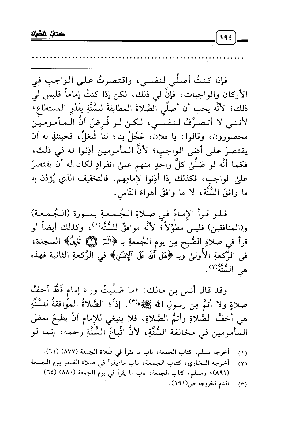 وقد قال أنس بن مالك: «ما صَلَّيتُ وراءَ إمامٍ قَطُّ أخفَّ صلاةٍ ولا أتمَّ مِن رسولِ الله صلّى الله عليه وسلّم» (¬3). إذاً؛ الصَّلاةُ الموافقةُ للسُّنَّةِ هي أخفُّ الصَّلاةِ وأتمُّ الصَّلاةِ، فلا ينبغي للإِمام أنْ يطيعَ بعضَ المأمومين في مخالفة السُّنَّةِ، لأنَّ اتِّباعَ السُّنَّةِ رحمة، إنما لو