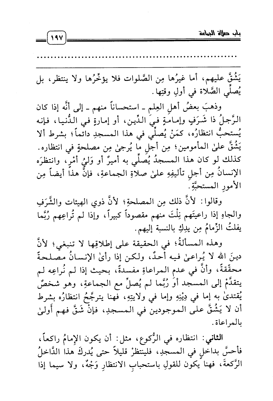 وذهبَ بعضُ أهلِ العِلمِ ـ استحساناً منهم ـ إلى أنَّه إذا كان الرَّجلُ ذا شَرَفٍ وإمامةٍ في الدِّين، أو إمارةٍ في الدُّنيا، فإنه يُستحبُّ انتظارُه، كمَنْ يُصلِّي في هذا المسجدِ دائماً؛ بشرط ألا يَشُقَّ على المأمومين؛ مِن أجلِ ما يُرجى مِن مصلحةٍ في انتظاره. كذلك لو كان هذا المسجدُ يُصلِّي به أميرٌ أو وَليُ أمْرٍ، وانتظرَه الإنسانُ مِن أجلِ تأليفِهِ على صلاةِ الجماعةِ، فإنَّ هذا أيضاً مِن الأمورِ المستحبَّةِ.