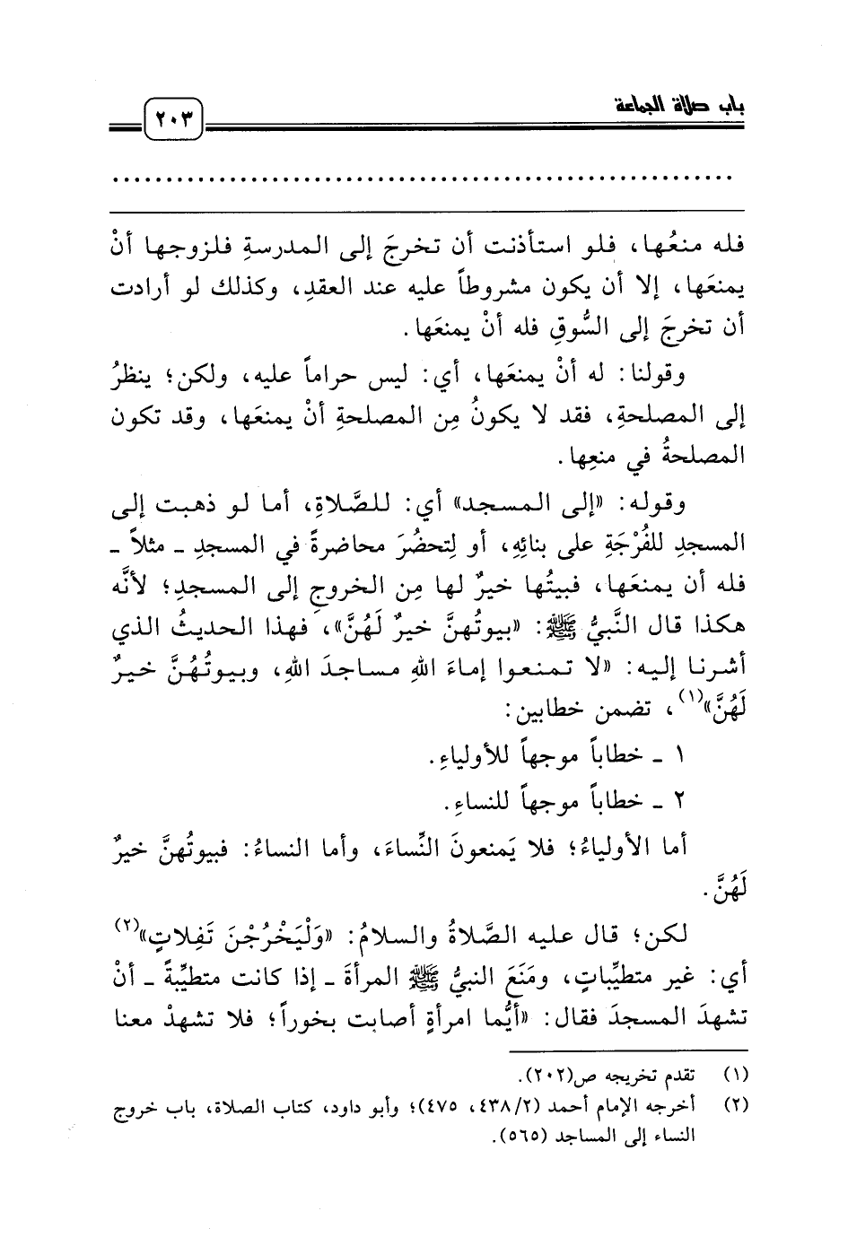 وقوله: «إلى المسجد» أي: للصَّلاةِ، أما لو ذهبت إلى المسجدِ للفُرْجَةِ على بنائِهِ، أو لِتحضُرَ محاضرةً في المسجدِ ـ مثلاً ـ فله أن يمنعَها، فبيتُها خيرٌ لها مِن الخروجِ إلى المسجدِ؛ لأنَّه هكذا قال النَّبيُّ صلّى الله عليه وسلّم: «بيوتُهنَّ خيرٌ لَهُنَّ»، فهذا الحديثُ الذي أشرنا إليه: «لا تمنعوا إماءَ اللهِ مساجدَ اللهِ، وبيوتُهُنَّ خيرٌ لَهُنَّ» (¬1)، تضمن خطابين: