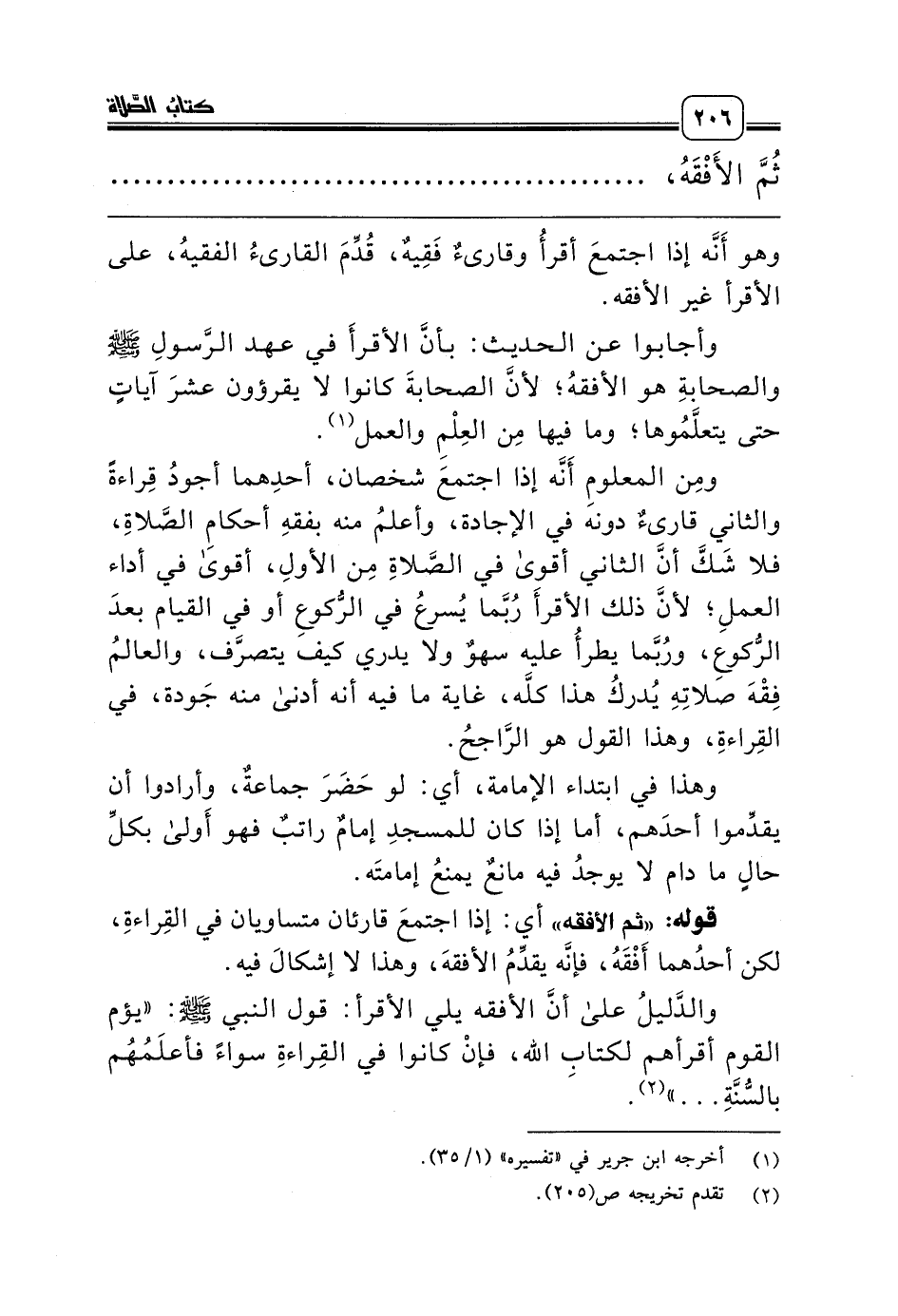 ومِن المعلومِ أَنَّه إذا اجتمعَ شخصان، أحدِهما أجودُ قِراءةً والثاني قارىءٌ دونه في الإجادة، وأعلمُ منه بفقهِ أحكامِ الصَّلاةِ، فلا شَكَّ أنَّ الثاني أقوى في الصَّلاةِ مِن الأولِ، أقوى في أداء العملِ؛ لأنَّ ذلك الأقرأَ رُبَّما يُسرعُ في الرُّكوعِ أو في القيام بعدَ الرُّكوعِ، ورُبَّما يطرأُ عليه سهوٌ ولا يدري كيف يتصرَّف، والعالمُ فِقْهَ صلاتِهِ يُدركُ هذا كلَّه، غاية ما فيه أنه أدنى منه جَودة، في القِراءةِ، وهذا القول هو الرَّاجحُ.