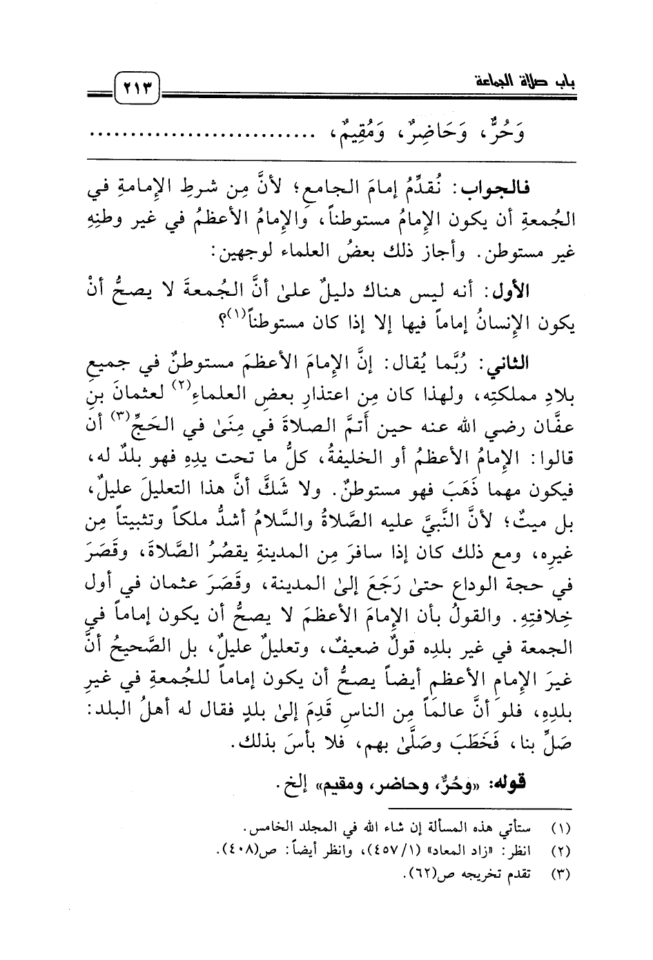 الأول: أنه ليس هناك دليلٌ على أنَّ الجُمعةَ لا يصحُّ أنْ يكون الإِنسانُ إماماً فيها إلا إذا كان مستوطناً (¬1)؟