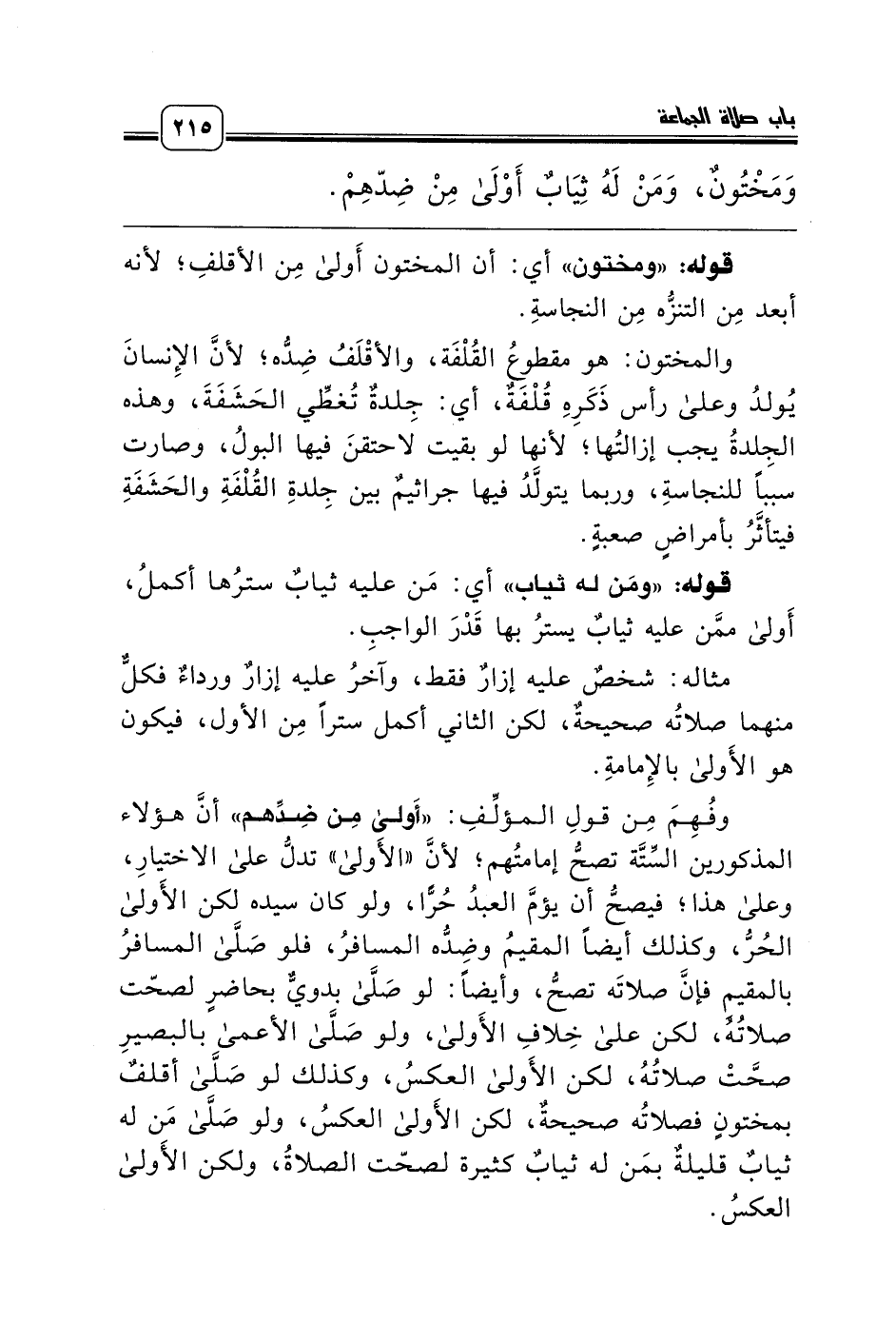 قوله: «ومختون» أي: أن المختون أَولى مِن الأقلفِ؛ لأنه أبعد مِن التنزُّه مِن النجاسةِ.