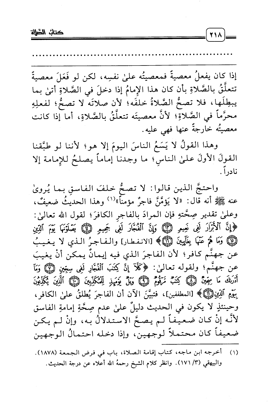 واحتجَّ الذين قالوا: لا تصحُّ خلفَ الفاسقِ بما يُروى عنه صلّى الله عليه وسلّم أنه قال: «لا يَؤمَّنَّ فاجرٌ مؤمناً» (¬1) وهذا الحديثُ ضعيفٌ، وعلى تقدير صِحَّتهِ فإن المرادَ بالفاجرِ الكافرَ؛ لقول الله تعالى: {يَعْلَمُونَ مَا تَفْعَلُونَ *إِنَّ الأَبْرَارَ لَفِي نَعِيمٍ *وَإِنَّ الْفُجَّارَ لَفِي جَحِيمٍ *يَصْلَوْنَهَا يَوْمَ الدِّينِ *وَمَا هُمْ عَنْهَا بِغَائِبِينَ *} [الانفطار] والفاجرُ الذي لا يغيبُ عن جهنَّم كافر؛ لأن الفاجرَ الذي فيه إيمانٌ يمكن أنْ يغيبَ عن جهنَّم؛ ولقوله تعالى: {يَوْمَ يَقُومُ النَّاسُ لِرَبِّ الْعَالَمِينَ *كَلاَّ إِنَّ كِتَابَ الْفُجَّارِ لَفِي سِجِّينٍ *وَمَا أَدْرَاكَ مَا سِجِّينٌ *كِتَابٌ مَرْقُومٌ *وَيْلٌ يَوْمَئِذٍ لِلْمُكَذِّبِينَ *الَّذِينَ يُكَذِّبُونَ بِيَوْمِ الدِّينِ *} [المطففين]، فتبيَّنَ الآن أن الفاجرَ يُطلقُ على الكافر، وحينئذٍ لا يكون في الحديث دليلٌ على عدم صِحَّةِ إمامةِ الفاسق لأنَّه إنْ كان ضعيفاً لم يصحَّ الاستدلالُ به، وإنْ لم يكن ضعيفاً كان محتملاً لوجهين، وإذا دخله احتمالُ الوجهين