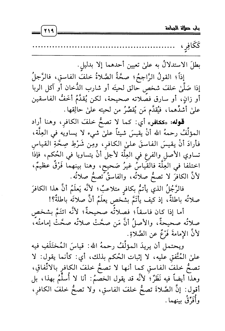 ويحتمل أن يريدَ المؤلِّفُ رحمه الله: قياسَ المُختَلَفِ فيه على المُتَّفقِ عليه، لا إثبات الحُكم بذلك، أي: كأنما يقول: لا تصحُّ خلفَ الفاسقِ كما أنها لا تصحُّ خلفَ الكافرِ بالاتِّفاقِ، وهذا أيضاً فيه نَظَرٌ؛ لأنَّه قد يقول الخصمُ: أنا لا أُسلِّمُ بهذا، بل أقول: إنَّ الصَّلاةَ تصحُّ خلفَ الفاسقِ، ولا تصحُّ خلفَ الكافرِ، وأُفَرِّقُ بينهما.
