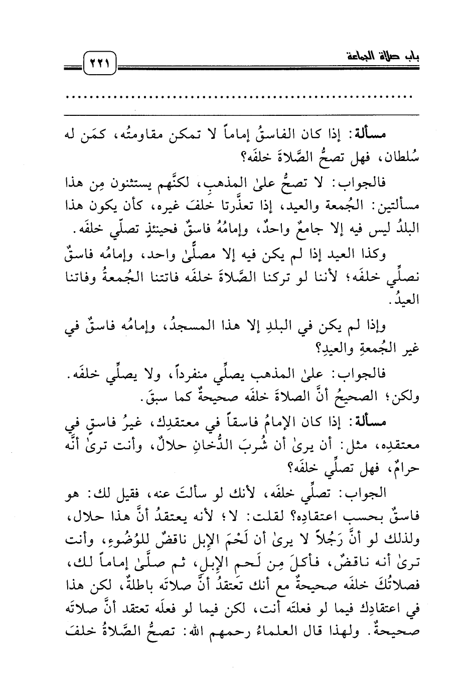 مسألة: إذا كان الفاسقُ إماماً لا تمكن مقاومتُه، كمَن له سُلطان، فهل تصحُّ الصَّلاةَ خلفَه؟