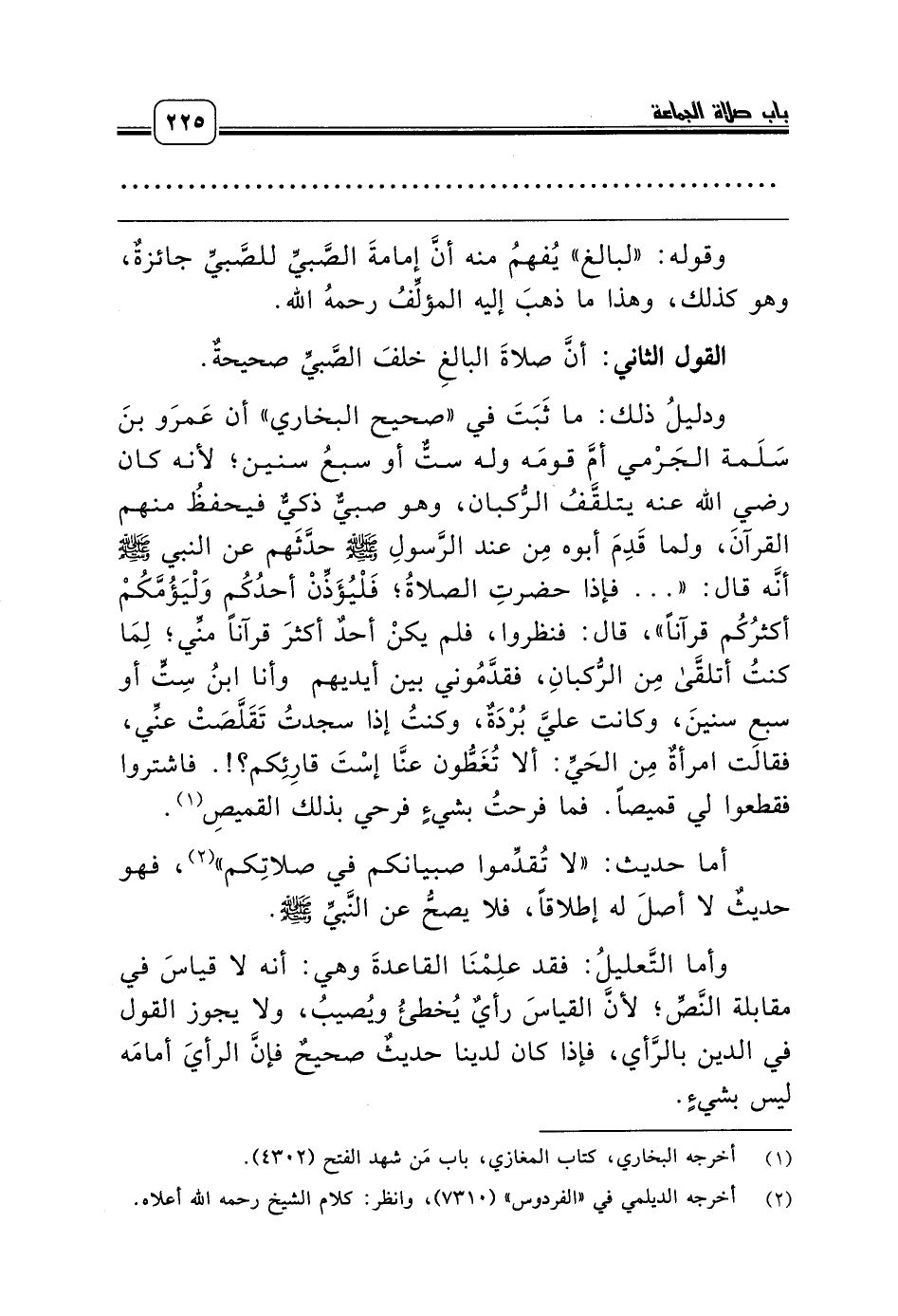 ودليلُ ذلك: ما ثَبَتَ في «صحيح البخاري» أن عَمرَو بنَ سَلَمة الجَرْمي أمَّ قومَه وله ستٌّ أو سبعُ سنين؛ لأنه كان رضي الله عنه يتلقَّفُ الرُّكبان، وهو صبيٌّ ذكيٌّ فيحفظُ منهم القرآنَ، ولما قَدِمَ أبوه مِن عند الرَّسولِ صلّى الله عليه وسلّم حدَّثَهم عن النبي صلّى الله عليه وسلّم أنَّه قال: « ... فإذا حضرتِ الصلاةُ؛ فَلْيُؤَذِّنْ أحدُكُم وَلْيَؤُمَّكُمْ أكثرُكُم قرآناً»، قال: فنظروا، فلم يكنْ أحدٌ أكثرَ قرآناً منِّي؛ لِمَا كنتُ أتلقَّى مِن الرُّكبانِ، فقدَّمُوني بين أيديهم وأنا ابنُ سِتٍّ أو سبعِ سنينَ، وكانت عليَّ بُرْدَةٌ، وكنتُ إذا سجدتُ تَقَلَّصَتْ عنِّي، فقالت امرأةٌ مِن الحَيِّ: ألا تُغَطُّون عنَّا إسْتَ قارِئِكم؟!. فاشتروا فقطعوا لي قميصاً. فما فرحتُ بشيءٍ فرحي بذلك القميصِ (¬1).