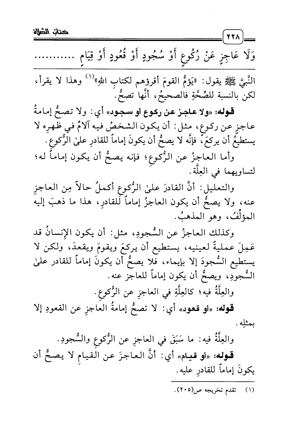 والتعليل: أنَّ القادرَ على الرُّكوعِ أكملُ حالاً مِن العاجزِ عنه، ولا يصحُّ أن يكون العاجزُ إماماً للقادرِ، هذا ما ذهبَ إليه المؤلِّفُ، وهو المذهبُ.