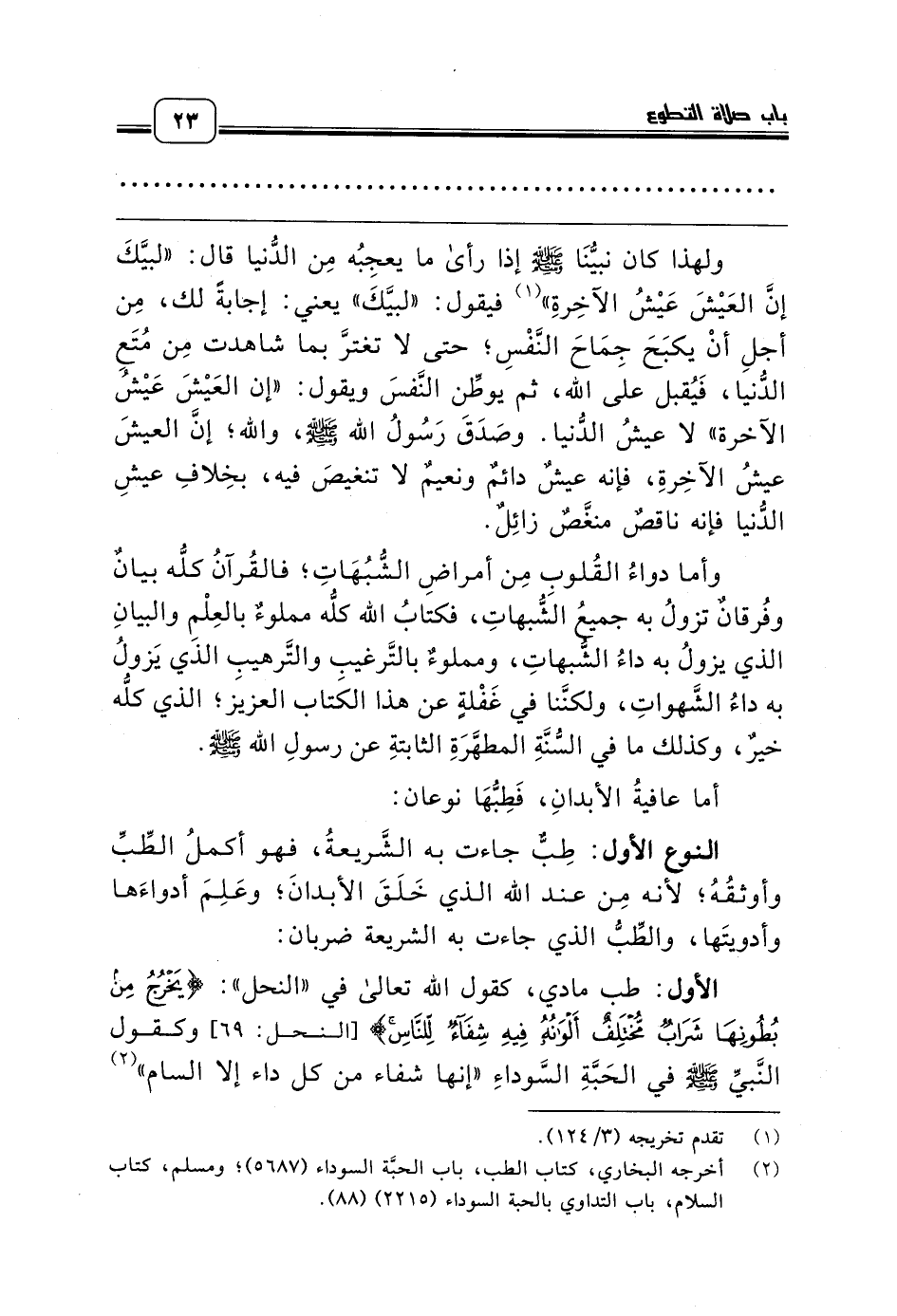 الأول: طب مادي، كقول الله تعالى في «النحل»: {يَخْرُجُ مِنْ بُطُونِهَا شَرَابٌ مُخْتَلِفٌ أَلْوَانُهُ فِيهِ شِفَاءٌ لِلنَّاسِ} [النحل: 69] وكقول النَّبيِّ صلّى الله عليه وسلّم في الحَبَّةِ السَّوداءِ «إنها شفاء من كل داء إلا السام» (¬2)