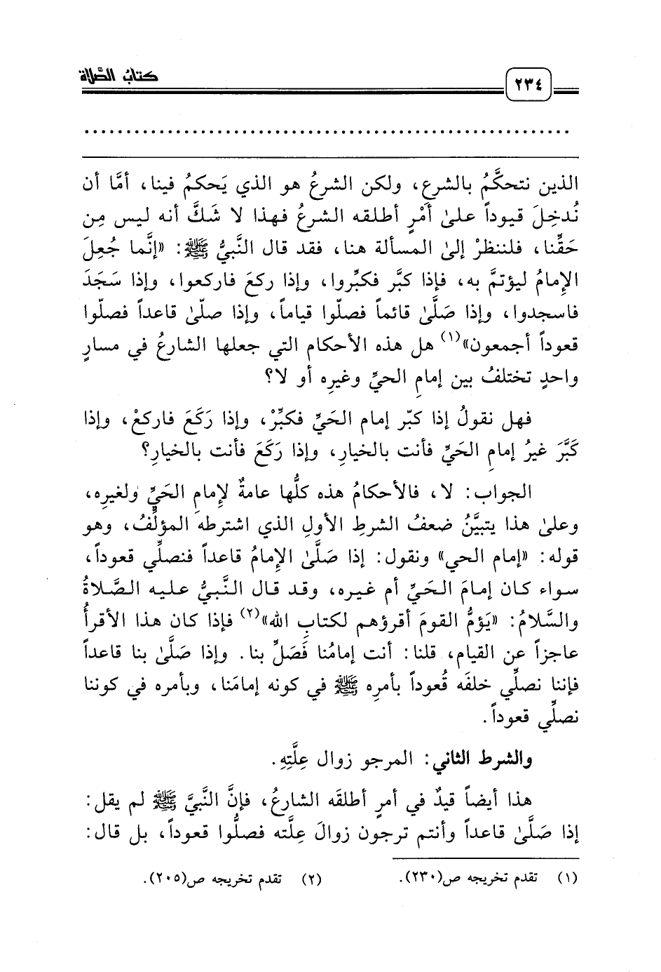 الذين نتحكَّمُ بالشرعِ، ولكن الشرعُ هو الذي يَحكمُ فينا، أمَّا أن نُدخِلَ قيوداً على أمْرٍ أطلقه الشرعُ فهذا لا شَكَّ أنه ليس مِن حَقِّنا، فلننظرْ إلى المسألة هنا، فقد قال النَّبيُّ صلّى الله عليه وسلّم: «إنَّما جُعِلَ الإِمامُ ليؤتمَّ به، فإذا كبَّر فكبِّروا، وإذا ركعَ فاركعوا، وإذا سَجَدَ فاسجدوا، وإذا صَلَّى قائماً فصلّوا قياماً، وإذا صلّى قاعداً فصلّوا قعوداً أجمعون» (¬1) هل هذه الأحكام التي جعلها الشارعُ في مسارٍ واحدٍ تختلفُ بين إمامِ الحيِّ وغيرِه أو لا؟