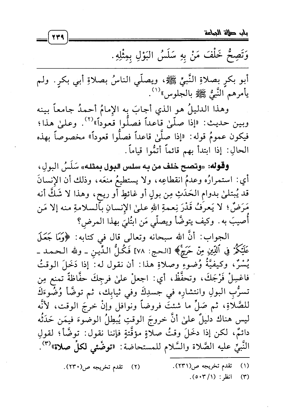 وقوله: «وتصح خلف من به سلس البول بمثله» سَلَسُ البولِ، أي: استمرارُه وعدمُ انقطاعِه، ولا يستطيعُ منعَه، وذلك أن الإِنسانَ قد يُبتلى بدوامِ الحَدَثِ مِن بولٍ أو غائطٍ أو ريحٍ، وهذا لا شَكَّ أنه مَرَضٌ؛ لا يَعرفُ قَدْرَ نِعمةِ اللهِ على الإِنسانِ بالسلامةِ منه إلا مَن أُصيبَ به. وكيف يتوضَّأ ويصلّي مَن ابتُليَ بهذا المرضِ؟