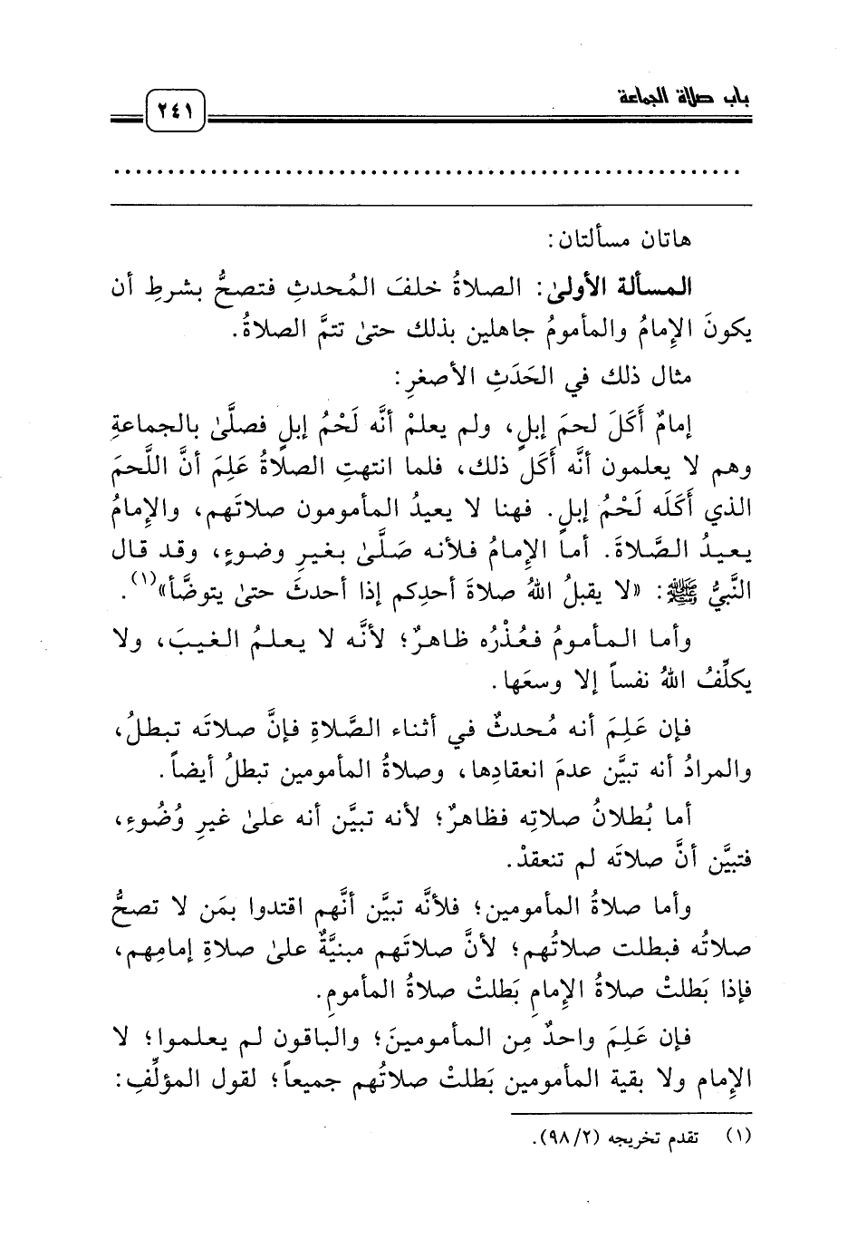 المسألة الأولى: الصلاةُ خلفَ المُحدثِ فتصحُّ بشرطِ أن يكونَ الإِمامُ والمأمومُ جاهلين بذلك حتى تتمَّ الصلاةُ.