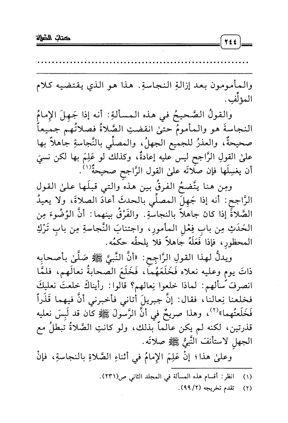ويدلُّ لهذا القولِ الرَّاجِحِ: «أنَّ النَّبيَّ صلّى الله عليه وسلّم صَلَّى بأصحابِه ذاتَ يومٍ وعليه نعلاه فَخَلَعَهُما، فَخَلَعَ الصحابةُ نعالَهم، فلمَّا انصرفَ سألهم: لماذا خلعوا نِعالهم؟ قالوا: رأيناكَ خلعتَ نعليكَ فخلعنا نِعالنا، فقال: إنَّ جبريلَ أتاني فأخبرني أنَّ فيهما قَذَراً فَخَلَعتُهما» (¬2)، وهذا صريحٌ في أنَّ الرَّسولَ صلّى الله عليه وسلّم كان قد لَبِسَ نعليه قذرتين، لكنه لم يكن عالماً بذلك، ولو كانتِ الصَّلاةُ تبطلُ مع الجهلِ لاستأنفَ النَّبيُّ صلّى الله عليه وسلّم صلاتَه.