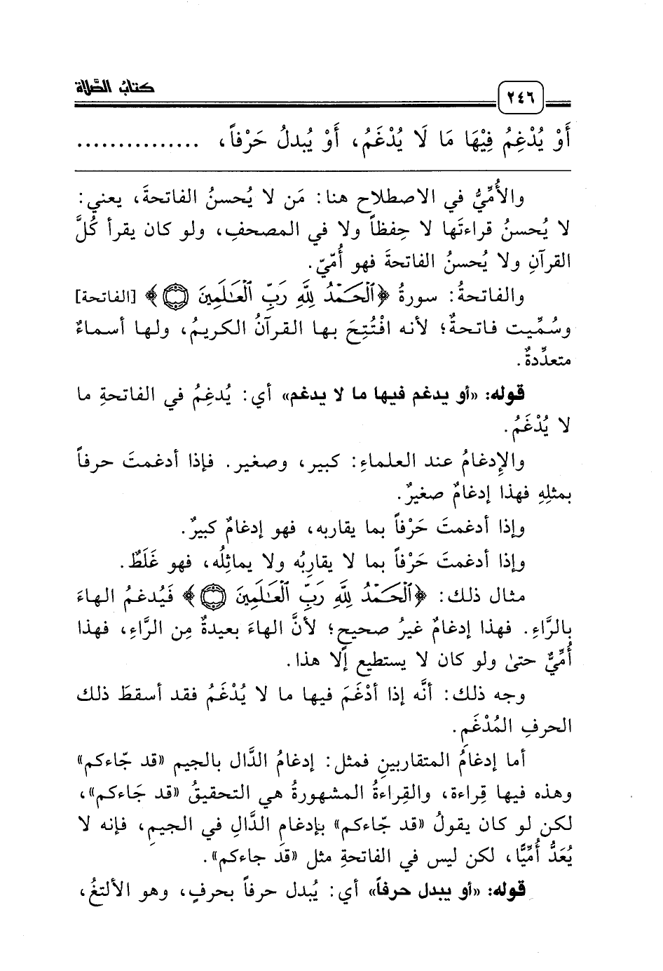 أما إدغامُ المتقاربينِ فمثل: إدغامُ الدَّال بالجيم «قد جّاءكم» وهذه فيها قِراءة، والقِراءةُ المشهورةُ هي التحقيقُ «قد جَاءكم»، لكن لو كان يقولُ «قد جّاءكم» بإدغامِ الدَّالِ في الجيمِ، فإنه لا يُعَدُّ أُمِّيًّا، لكن ليس في الفاتحةِ مثل «قد جاءكم».