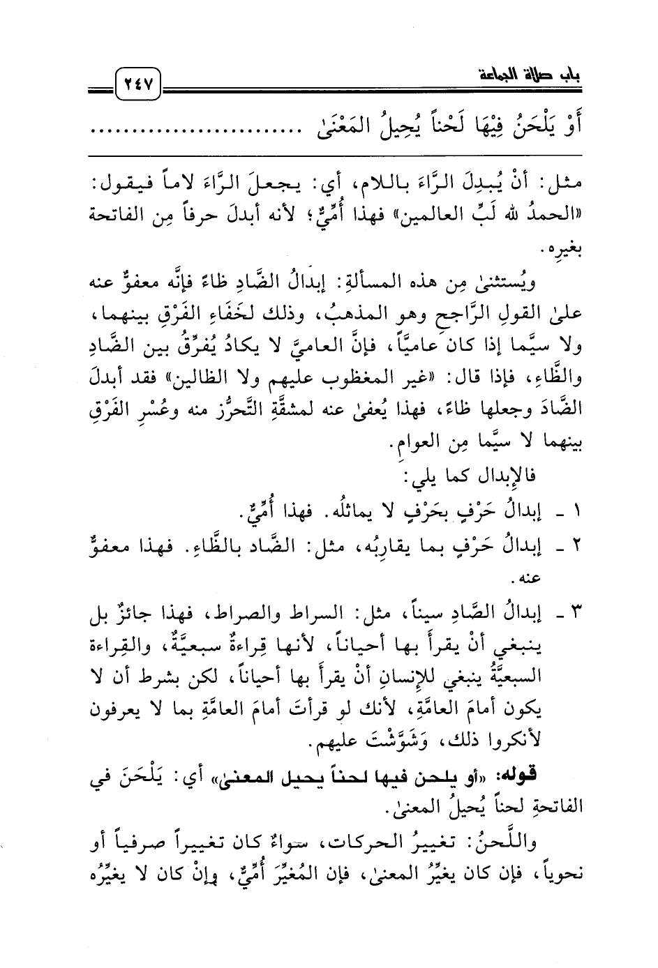 ويُستثنى مِن هذه المسألةِ: إبدالُ الضَّادِ ظاءً فإنَّه معفوٌّ عنه على القولِ الرَّاجحِ وهو المذهبُ، وذلك لخَفَاءِ الفَرْقِ بينهما، ولا سيَّما إذا كان عاميَّاً، فإنَّ العاميَّ لا يكادُ يُفرِّقُ بين الضَّادِ والظَّاءِ، فإذا قال: «غير المغظوب عليهم ولا الظالين» فقد أبدلَ الضَّادَ وجعلها ظاءً، فهذا يُعفى عنه لمشقَّةِ التَّحرُّز منه وعُسْرِ الفَرْقِ بينهما لا سيَّما مِن العوامِ.