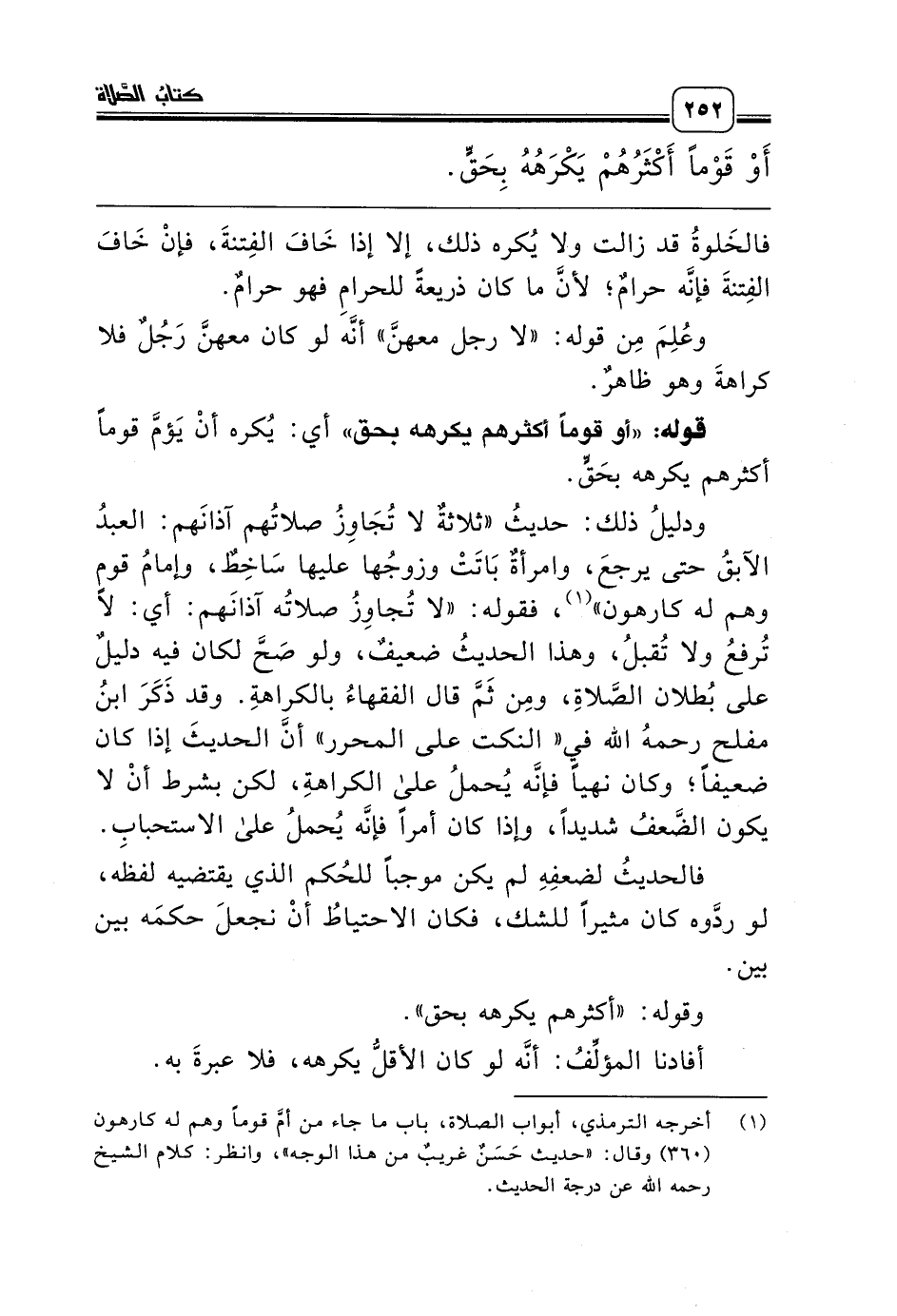 (¬1) أخرجه الترمذي، أبواب الصلاة، باب ما جاء من أمَّ قوماً وهم له كارهون (360) وقال: «حديث حَسَنٌ غريبٌ من هذا الوجه»، وانظر: كلام الشيخ رحمه الله عن درجة الحديث.