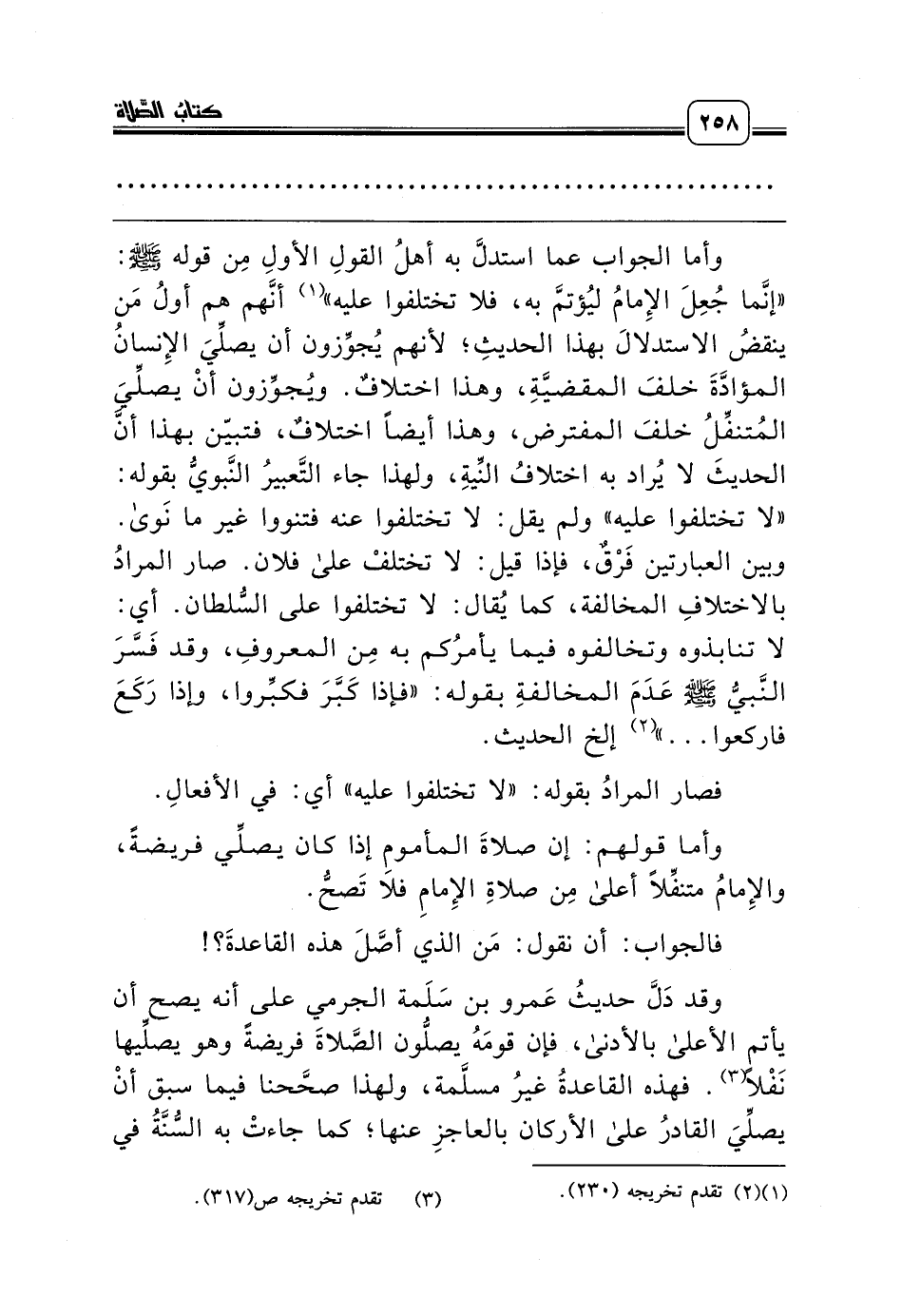 وأما الجواب عما استدلَّ به أهلُ القولِ الأولِ مِن قوله صلّى الله عليه وسلّم: «إنَّما جُعِلَ الإِمامُ ليُؤتمَّ به، فلا تختلفوا عليه» (¬1) أنَّهم هم أولُ مَن ينقضُ الاستدلالَ بهذا الحديثِ؛ لأنهم يُجوِّزون أن يصلِّيَ الإِنسانُ المؤادَّةَ خلفَ المقضيَّةِ، وهذا اختلافٌ. ويُجوِّزون أنْ يصلِّيَ المُتنفِّلُ خلفَ المفترض، وهذا أيضاً اختلافٌ، فتبيّن بهذا أنَّ الحديثَ لا يُراد به اختلافُ النِّيةِ، ولهذا جاء التَّعبيرُ النَّبويُّ بقوله: «لا تختلفوا عليه» ولم يقل: لا تختلفوا عنه فتنووا غير ما نَوى. وبين العبارتين فَرْقٌ، فإذا قيل: لا تختلفْ على فلان. صار المرادُ بالاختلافِ المخالفة، كما يُقال: لا تختلفوا على السُّلطان. أي: لا تنابذوه وتخالفوه فيما يأمرُكم به مِن المعروفِ، وقد فَسَّرَ النَّبيُّ صلّى الله عليه وسلّم عَدَمَ المخالفةِ بقوله: «فإذا كَبَّرَ فكبِّروا، وإذا رَكَعَ فاركعوا ... » (¬2) إلخ الحديث.