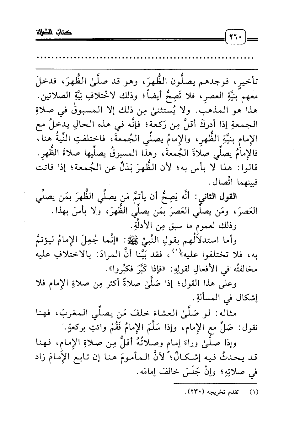 تأخيرٍ، فوجدهم يصلُّون الظُّهرَ، وهو قد صلَّى الظُّهرَ، فدخلَ معهم بنيَّةِ العصرِ، فلا تَصِحُّ أيضاً؛ وذلك لاخْتلافِ نِيَّةِ الصلاتين. هذا هو المذهب. ولا يُستثنى مِن ذلك إلا المسبوقُ في صلاةِ الجمعةِ إذا أدركَ أقلَّ مِن رَكعة؛ فإنَّه في هذه الحالِ يدخلُ مع الإِمامِ بنيَّةِ الظُّهرِ، والإِمامُ يصلِّي الجُمعةَ، فاختلفتِ النِّيةُ هنا، فالإِمامُ يصلِّي صلاةَ الجُمعةَ، وهذا المسبوقُ يصلِّيها صلاةَ الظُّهرِ. قالوا: هذا لا بأس به؛ لأن الظُّهرَ بَدَلٌ عن الجُمعة؛ إذا فاتت فبينهما اتِّصال.