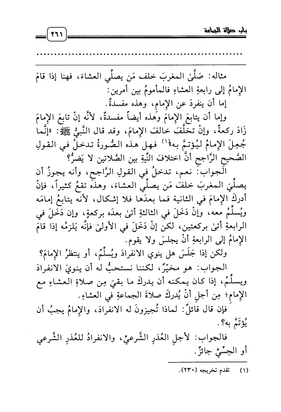 وإما أن يتابعَ الإِمامَ وهذه أيضاً مفسدةٌ، لأنَّه إنْ تابعَ الإِمامَ زَادَ ركعةً، وإنْ تخلَّفَ خالفَ الإِمامَ، وقد قال النَّبيُّ صلّى الله عليه وسلّم: «إنَّما جُعِلَ الإِمامُ ليُؤتمَّ به» (¬1) فهل هذه الصُّورةُ تدخلُ في القولِ الصَّحيحِ الرَّاجحِ أنَّ اختلافَ النِّيةِ بين الصَّلاتين لا يَضرُّ؟