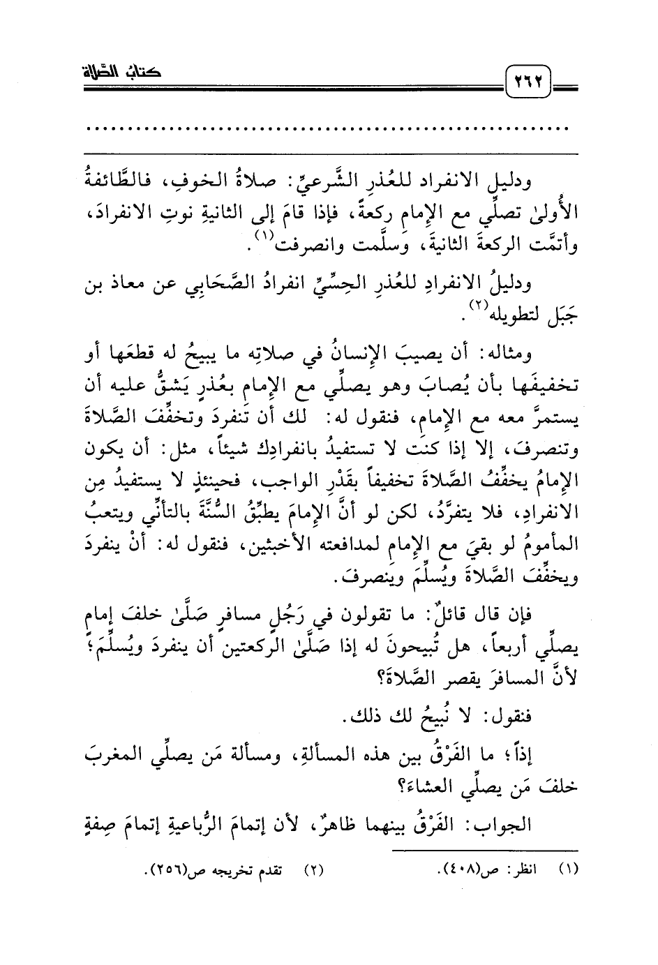 ودليل الانفراد للعُذرِ الشَّرعيِّ: صلاةُ الخوفِ، فالطَّائفةُ الأُولى تصلِّي مع الإِمامِ ركعةً، فإذا قامَ إلى الثانيةِ نوتِ الانفرادَ، وأتمَّت الركعةَ الثانيةَ، وسلَّمت وانصرفت (¬1).