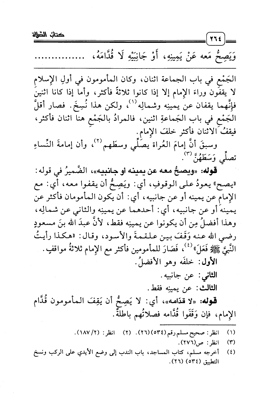 قوله: «ويصحُّ معه عن يمينه أو جانبيه»، الضَّميرُ في قوله: «يصح» يعودُ على الوقوفِ، أي: ويَصِحُّ أن يقفوا معه، أي: مع الإِمامِ عن يمينه أو عن جانبيه، أي: أن يكون المأمومان فأكثر عن يمينه أو عن جانبيه، أي: أحدهما عن يمينِه والثاني عن شمالِه، وهذا أفضلُ مِن أن يكونوا عن يمينِه فقط، لأنَّ عبدَ الله بنَ مسعودٍ رضي الله عنه وَقَفَ بين علقمةَ والأسود، وقال: «هكذا رأيتُ النَّبيَّ صلّى الله عليه وسلّم فَعَلَ» (¬4)، فَصَارَ للمأمومين فأكثر مع الإِمام ثلاثةُ مواقفٍ.