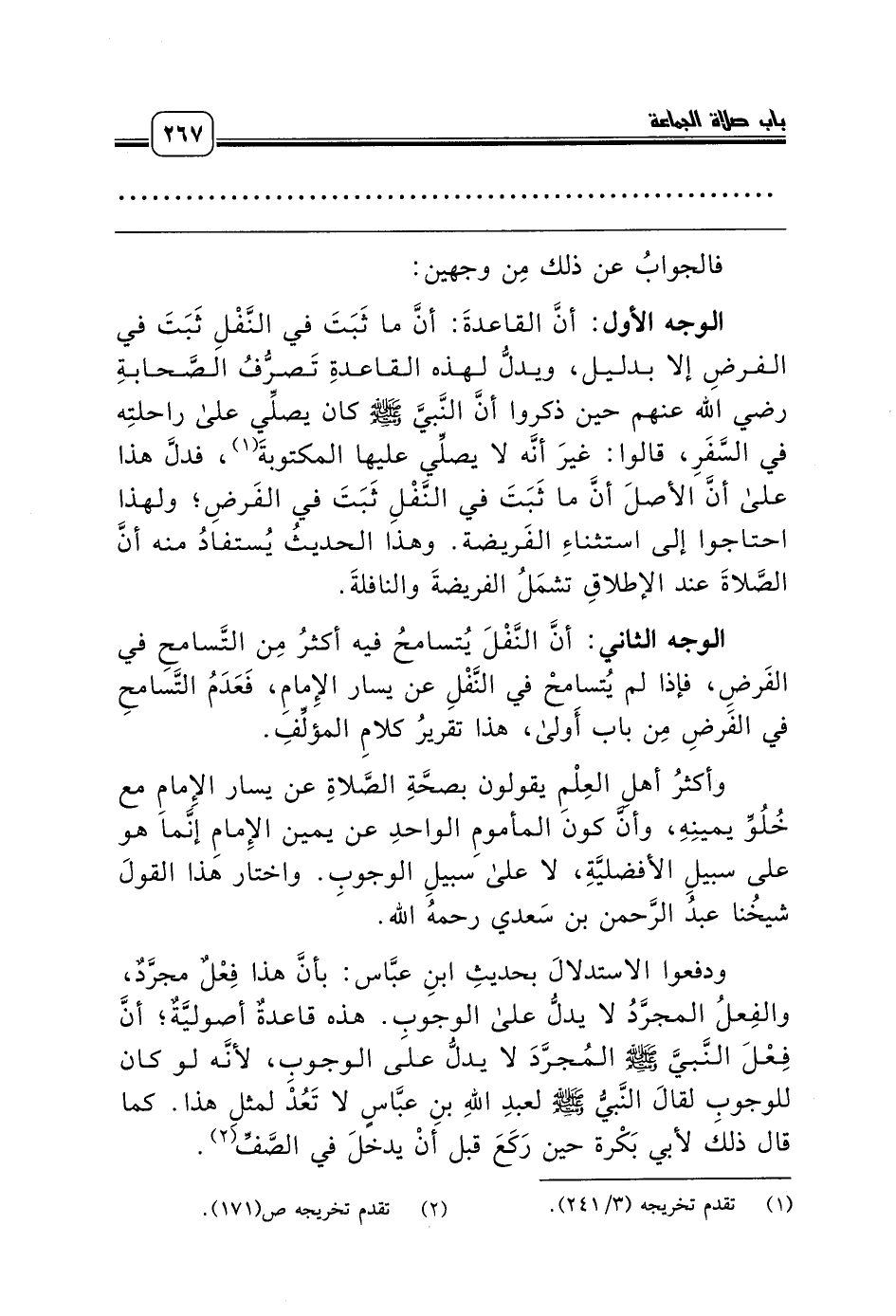 ودفعوا الاستدلالَ بحديثِ ابنِ عبَّاس: بأنَّ هذا فِعْلٌ مجرَّدٌ، والفِعلُ المجرَّدُ لا يدلُّ على الوجوبِ. هذه قاعدةٌ أصوليَّةٌ؛ أنَّ فِعْلَ النَّبيَّ صلّى الله عليه وسلّم المُجرَّدَ لا يدلُّ على الوجوبِ، لأنَّه لو كان للوجوبِ لقالَ النَّبيُّ صلّى الله عليه وسلّم لعبدِ اللهِ بنِ عبَّاسٍ لا تَعُدْ لمثلِ هذا. كما قال ذلك لأبي بَكْرة حين رَكَعَ قبل أنْ يدخلَ في الصَّفِّ (¬2).