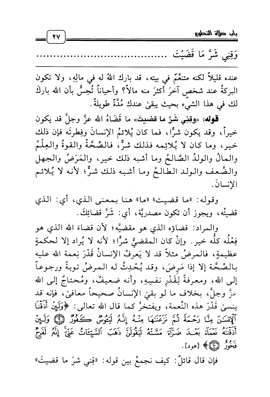 فإن قال قائلٌ: كيف نجمعُ بين قوله: «قِني شرَ ما قضيتَ»