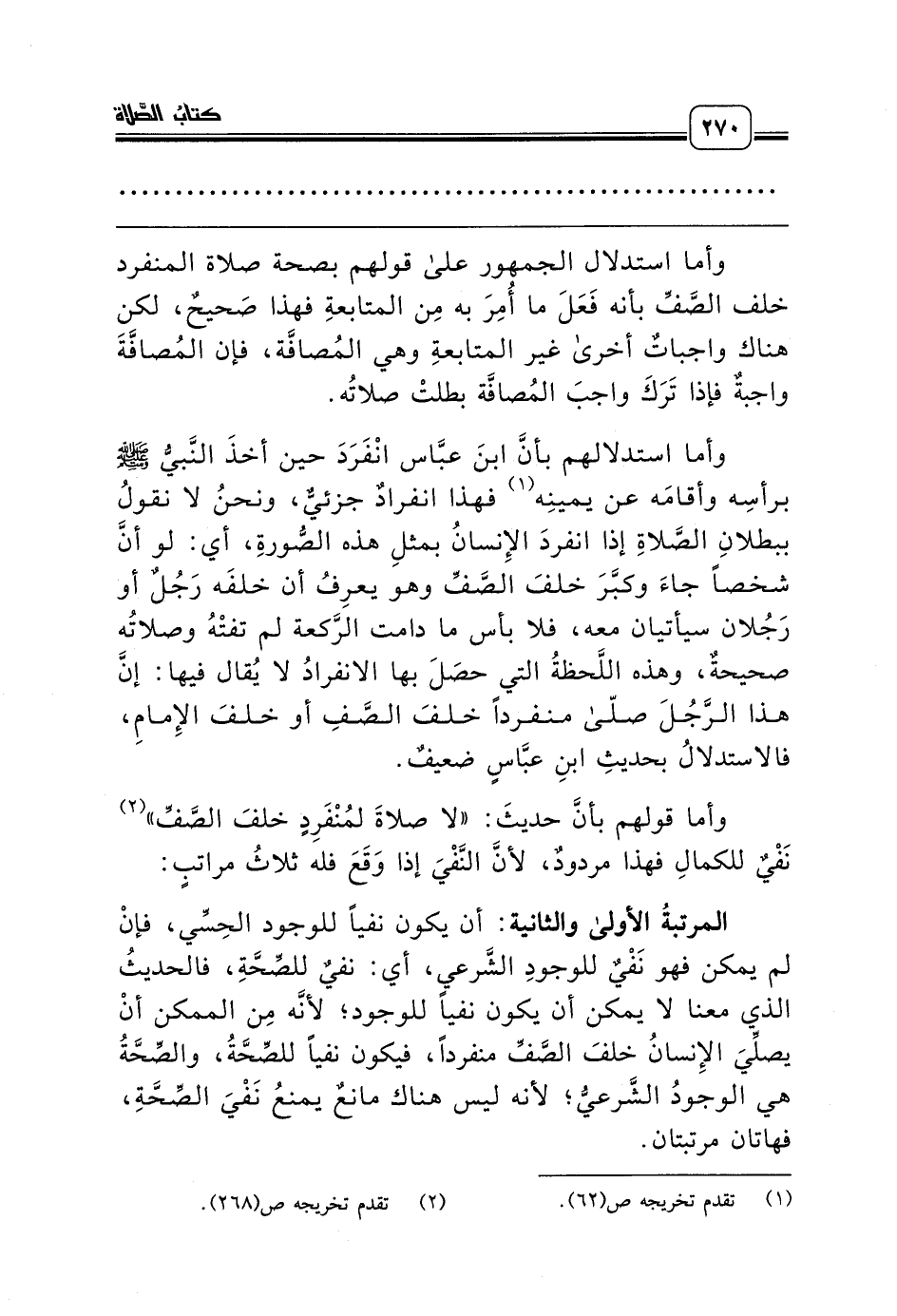 وأما قولهم بأنَّ حديثَ: «لا صلاةَ لمُنْفَرِدٍ خلفَ الصَّفِّ» (¬2) نَفْيٌ للكمالِ فهذا مردودٌ، لأنَّ النَّفْيَ إذا وَقَعَ فله ثلاثُ مراتبٍ: