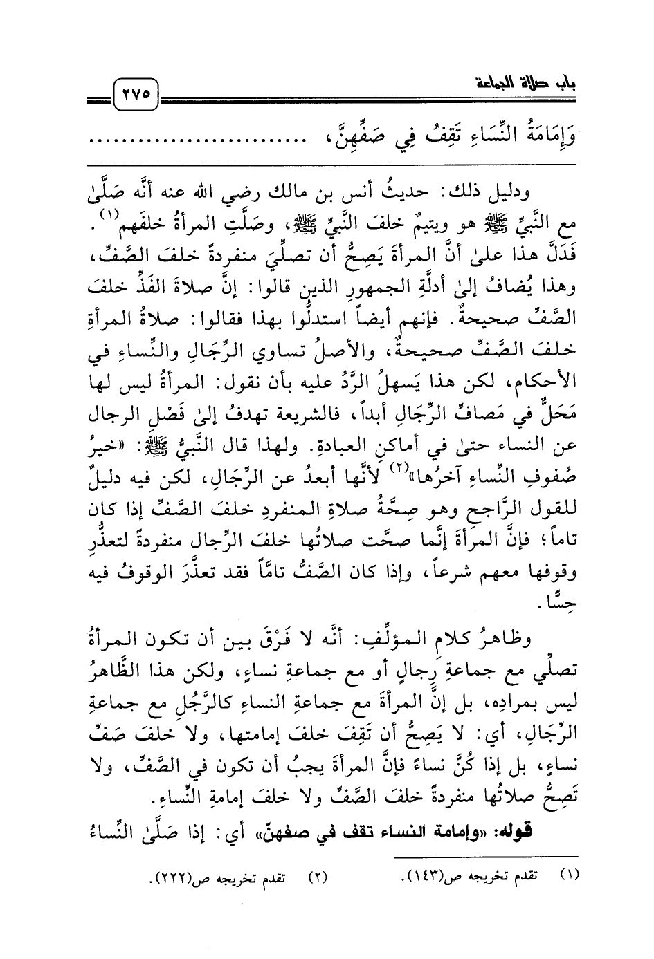 ودليل ذلك: حديثُ أنس بن مالك رضي الله عنه أنَّه صَلَّى مع النَّبيِّ صلّى الله عليه وسلّم هو ويتيمٌ خلفَ النَّبيِّ صلّى الله عليه وسلّم، وصَلَّتِ المرأةُ خلفَهم (¬1). فَدَلَّ هذا على أنَّ المرأةَ يَصِحُّ أن تصلِّيَ منفردةً خلفَ الصَّفِّ، وهذا يُضافُ إلى أدلَّةِ الجمهورِ الذين قالوا: إنَّ صلاةَ الفَذِّ خلفَ الصَّفِّ صحيحةٌ. فإنهم أيضاً استدلُّوا بهذا فقالوا: صلاةُ المرأةِ خلفَ الصَّفِّ صحيحةٌ، والأصلُ تساوي الرِّجَالِ والنِّساءِ في الأحكام، لكن هذا يَسهلُ الرَّدُ عليه بأن نقول: المرأةُ ليس لها مَحَلٌّ في مَصافِّ الرِّجَالِ أبداً، فالشريعة تهدفُ إلى فَصْلِ الرجال عن النساء حتى في أماكنِ العبادةِ. ولهذا قال النَّبيُّ صلّى الله عليه وسلّم: «خيرُ صُفوفِ النِّساءِ آخرُها» (¬2) لأنَّها أبعدُ عن الرِّجَالِ، لكن فيه دليلٌ للقول الرَّاجحِ وهو صِحَّةُ صلاةِ المنفردِ خلفَ الصَّفِّ إذا كان تاماً؛ فإنَّ المرأةَ إنَّما صحَّت صلاتُها خلفَ الرِّجال منفردةً لتعذُّرِ وقوفها معهم شرعاً، وإذا كان الصَّفُّ تامَّاً فقد تعذَّرَ الوقوفُ فيه حِسًّا.