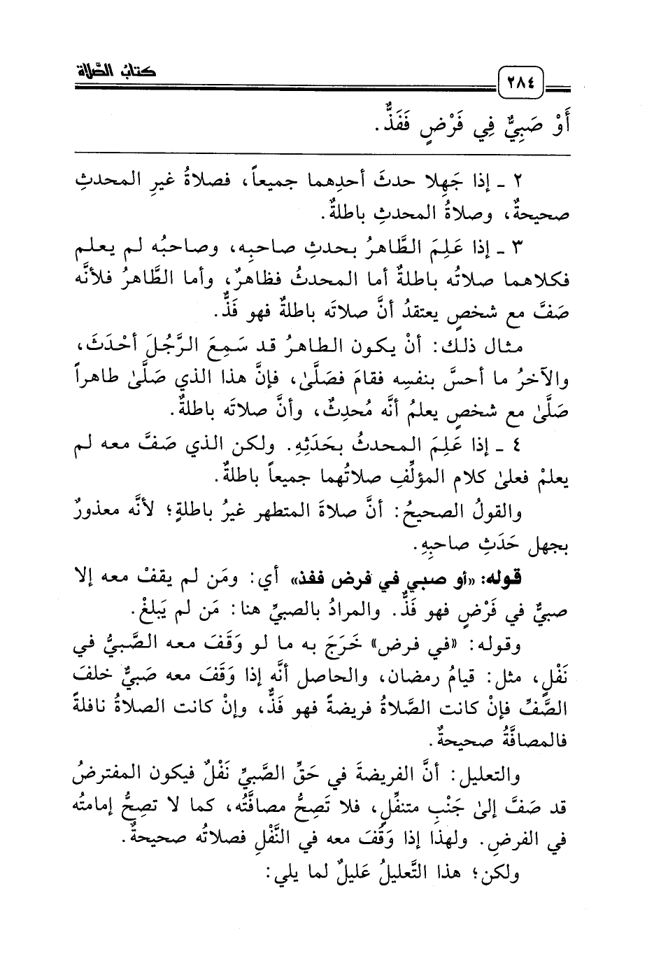والتعليل: أنَّ الفريضةَ في حَقِّ الصَّبيِّ نَفْلٌ فيكون المفترضُ قد صَفَّ إلى جَنْبِ متنفِّلٍ، فلا تَصِحُّ مصافَّتُه، كما لا تصِحُّ إمامتُه في الفرضِ. ولهذا إذا وَقَفَ معه في النَّفْلِ فصلاتُه صحيحةٌ.