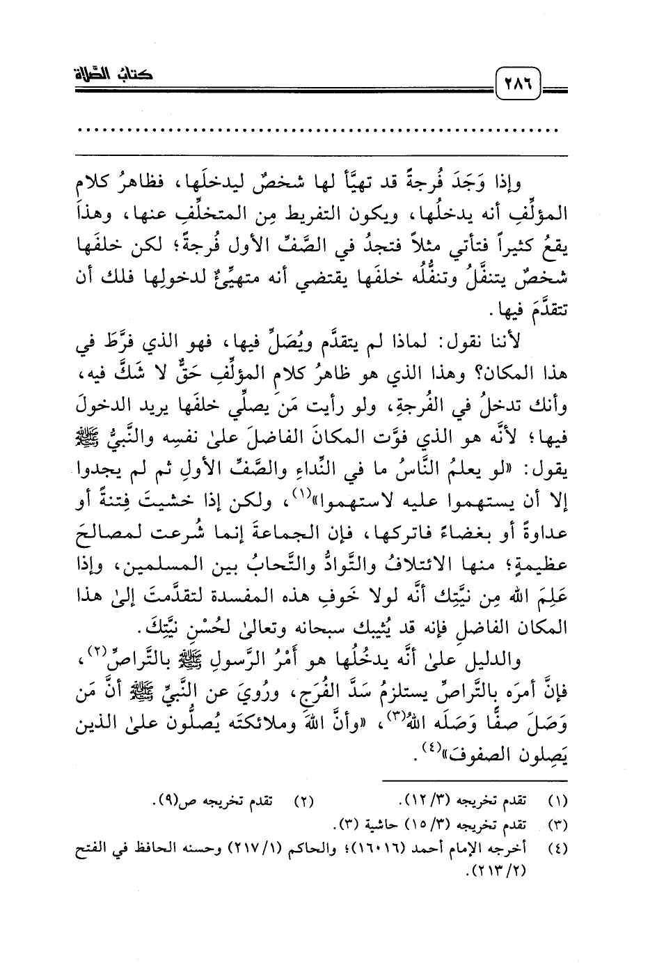 لأننا نقول: لماذا لم يتقدَّم ويُصَلِّ فيها، فهو الذي فرَّطَ في هذا المكان؟ وهذا الذي هو ظاهرُ كلامِ المؤلِّفِ حَقٌّ لا شَكَّ فيه، وأنك تدخلُ في الفُرجةِ، ولو رأيت مَن يصلِّي خلفَها يريد الدخولَ فيها؛ لأنَّه هو الذي فوَّت المكانَ الفاضلَ على نفسِه والنَّبيُّ صلّى الله عليه وسلّم يقول: «لو يعلمُ النَّاسُ ما في النِّداءِ والصَّفِّ الأولِ ثم لم يجدوا إلا أن يستهموا عليه لاستهموا» (¬1)، ولكن إذا خشيتَ فِتنةً أو عداوةً أو بغضاءً فاتركها، فإن الجماعةَ إنما شُرعت لمصالحَ عظيمةٍ؛ منها الائتلافُ والتَّوادُّ والتَّحابُ بين المسلمين، وإذا عَلِمَ الله مِن نيَّتِك أنَّه لولا خَوفِ هذه المفسدة لتقدَّمتَ إلى هذا المكان الفاضلِ فإنه قد يُثيبك سبحانه وتعالى لحُسْنِ نيَّتِكَ.
