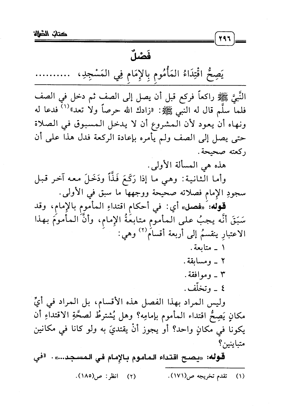 وليس المراد بهذا الفصل هذه الأقسام، بل المراد في أيِّ مكانٍ يَصِحُّ اقتداء المأموم بإمامِه؟ وهل يُشترطُ لصحَّةِ الاقتداءِ أن يكونا في مكانٍ واحد؟ أو يجوز أنْ يقتديَ به ولو كانا في مكانين متباينين؟