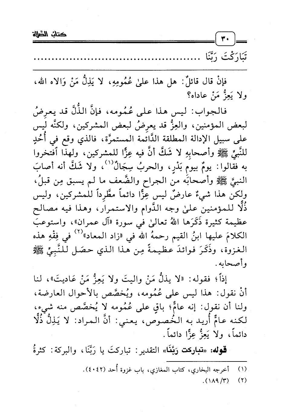 إذاً؛ فقوله: «لا يذلُّ مَنْ واليتَ ولا يَعِزُّ مَنْ عَاديتَ»، لنا أنْ نقول: هذا ليس على عُمُومه، ويُخصَّص بالأحوال العارضة، ولنا أن نقول: إنه عامٌّ؛ باقٍ على عُمُومه لا يُخصَّص منه شيء، لكنه عامٌّ أُريد به الخُصوص، يعني: أنَّ المراد: لا يَذِلُّ ذُلًّا دائماً، ولا يَعِزُّ عِزًّا دائماً.