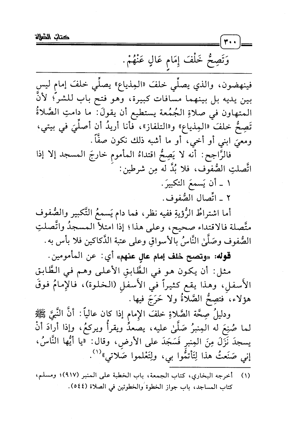 ودليلُ صِحَّة الصَّلاةِ خلفَ الإِمامِ إذا كان عالياً: أنَّ النَّبيَّ صلّى الله عليه وسلّم لما صُنِعَ له المِنبرُ صَلَّى عليه، يصعدُ ويقرأُ ويركعُ، وإذا أرادَ أنْ يسجدَ نَزَلَ مِنَ المِنبرِ فَسَجَدَ على الأرضِ، وقال: «يا أيُّها النَّاسُ، إني صَنَعتُ هذا لِتَأتمُّوا بي، ولِتَعْلموا صَلاتي» (¬1).