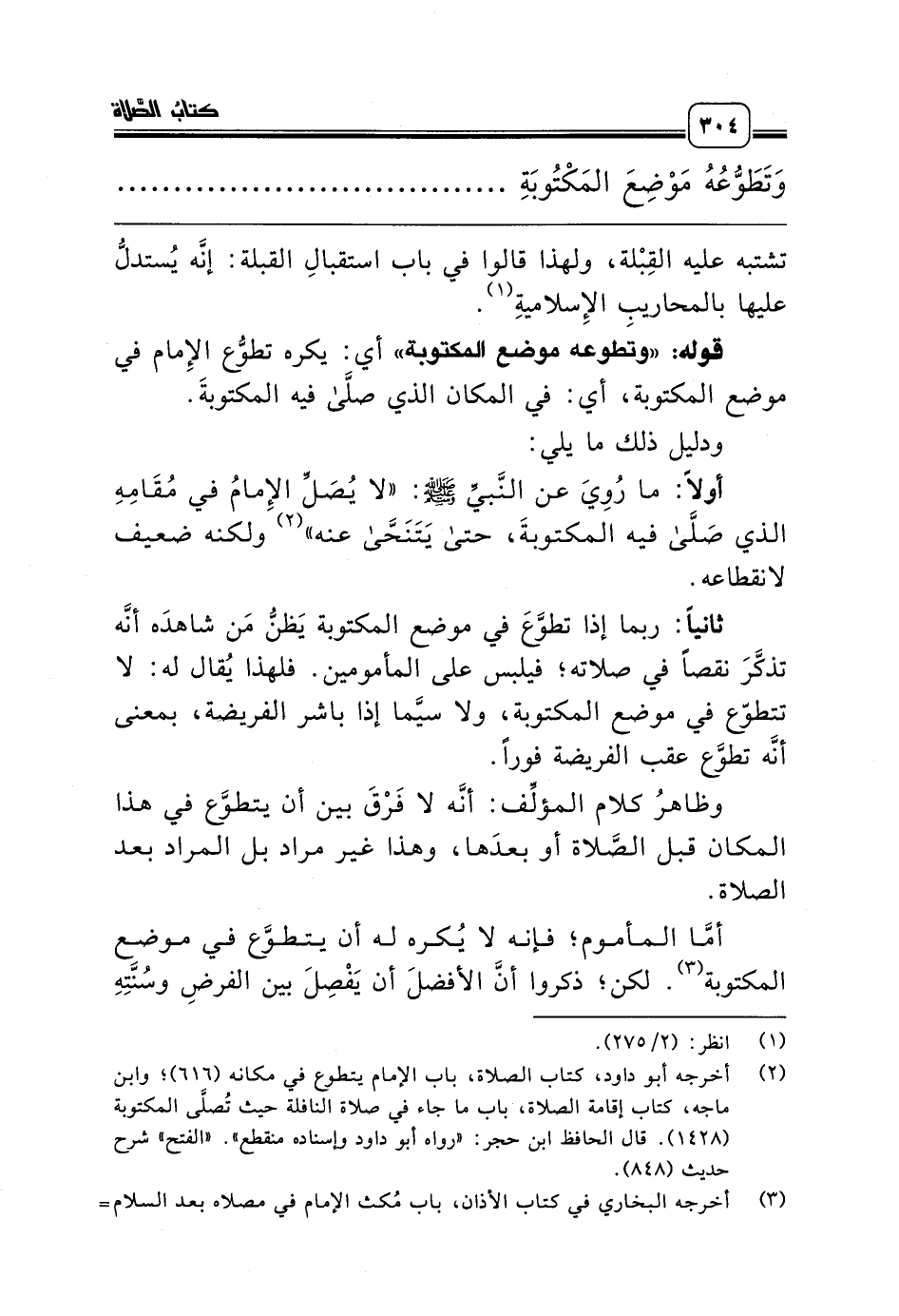 (¬2) أخرجه أبو داود، كتاب الصلاة، باب الإمام يتطوع في مكانه (616)؛ وابن ماجه، كتاب إقامة الصلاة، باب ما جاء في صلاة النافلة حيث تُصلَّى المكتوبة (1428). قال الحافظ ابن حجر: «رواه أبو داود وإسناده منقطع». «الفتح» شرح حديث (848).