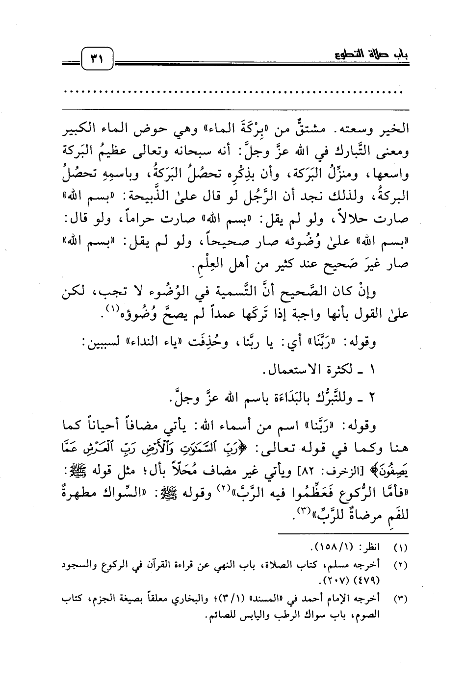 وقوله: «رَبَّنا» اسم من أسماء الله: يأتي مضافاً أحياناً كما هنا وكما في قوله تعالى: {رَبِّ السَّمَاوَاتِ وَالأَرْضِ رَبِّ الْعَرْشِ عَمَّا يَصِفُونَ} [الزخرف: 82] ويأتي غير مضاف مُحَلاًّ بأل؛ مثل قوله صلّى الله عليه وسلّم: «فأمَّا الرُّكوع فَعَظِّمُوا فيه الرَّبَّ» (¬2) وقوله صلّى الله عليه وسلّم: «السِّواك مطهرةٌ للفَمِ مرضاةٌ للرَّبِّ» (¬3).