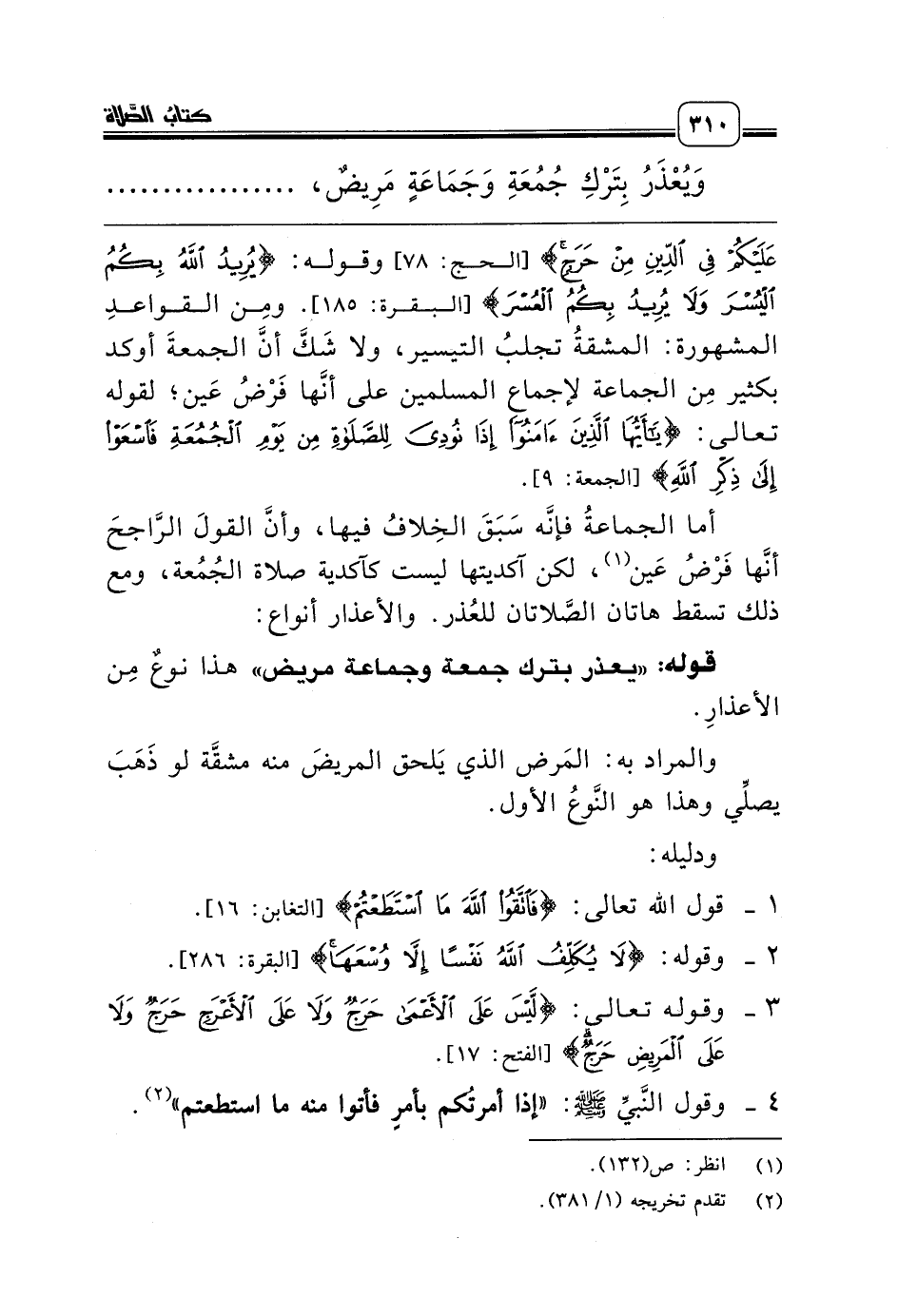 عَلَيْكُمْ فِي الدِّينِ مِنْ حَرَجٍ} [الحج: 78] وقوله: {يُرِيدُ اللَّهُ بِكُمُ الْيُسْرَ وَلاَ يُرِيدُ بِكُمُ الْعُسْرَ} [البقرة: 185]. ومِن القواعدِ المشهورة: المشقةُ تجلبُ التيسير، ولا شَكَّ أنَّ الجمعةَ أوكد بكثير مِن الجماعة لإجماعِ المسلمين على أنَّها فَرْضُ عَين؛ لقوله تعالى: {يَاأَيُّهَا الَّذِينَ آمَنُوا إِذَا نُودِيَ لِلصَّلاَةِ مِنْ يَوْمِ الْجُمُعَةِ فَاسْعَوْا إِلَى ذِكْرِ اللَّهِ} [الجمعة: 9].