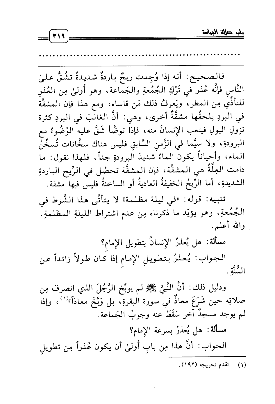 فالصحيح: أنه إذا وُجِدت ريحٌ باردةٌ شديدةٌ تشُقُّ على النَّاسِ فإنَّه عُذر في تَرْكِ الجُمُعةِ والجَماعة، وهو أَولى مِن العُذرِ للتأذِّي مِن المطر، ويَعرفُ ذلك مَن قاساه، ومع هذا فإن المشقَّة في البردِ يلحقُها مشقَّةٌ أخرى، وهي: أنَّ الغالبَ في البردِ كثرة نزولِ البولِ فيتعب الإِنسانُ منه، فإذا توضَّأ شَقَّ عليه الوُضُوءُ مع البرودةِ، ولا سيَّما في الزَّمنِ السَّابقِ فليس هناك سخَّانات تُسخِّنُ الماء، وأحياناً يكون الماءُ شديدَ البرودةِ جداً، فلهذا نقول: ما دامت العِلَّةُ هي المشقَّة، فإن المشقَّة تحصُل في الرِّيح الباردةِ الشديدةِ، أما الرِّيحُ الخفيفةُ العاديةُ أو الساخنةُ فليس فيها مشقة.