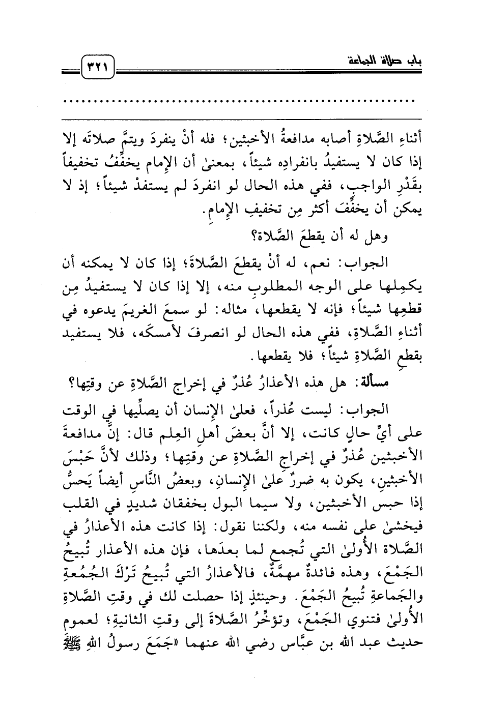 الجواب: ليست عُذراً، فعلى الإِنسان أن يصلِّيها في الوقت على أيِّ حالٍ كانت، إلا أنَّ بعضَ أهلِ العِلم قال: إنَّ مدافعةَ الأخبثين عُذرٌ في إخراجِ الصَّلاةِ عن وقتِها؛ وذلك لأنَّ حَبْسَ الأخبثينِ، يكون به ضررٌ على الإِنسانِ، وبعضُ النَّاسِ أيضاً يَحسُّ إذا حبس الأخبثين، ولا سيما البول بخفقان شديدٍ في القلب فيخشى على نفسه منه، ولكننا نقول: إذا كانت هذه الأعذارُ في الصَّلاة الأُولى التي تُجمع لما بعدَها، فإن هذه الأعذار تُبيحُ الجَمْعَ، وهذه فائدةٌ مهمَّةٌ، فالأعذارُ التي تُبيحُ تَرْكَ الجُمُعةِ والجَماعةِ تُبيحُ الجَمْعَ. وحينئذٍ إذا حصلت لك في وقتِ الصَّلاةِ الأُولى فتنوي الجَمْعَ، وتؤخِّرُ الصَّلاةَ إلى وقتِ الثانيةِ؛ لعمومِ حديث عبد الله بن عبَّاس رضي الله عنهما «جَمَعَ رسولُ اللهِ صلّى الله عليه وسلّم