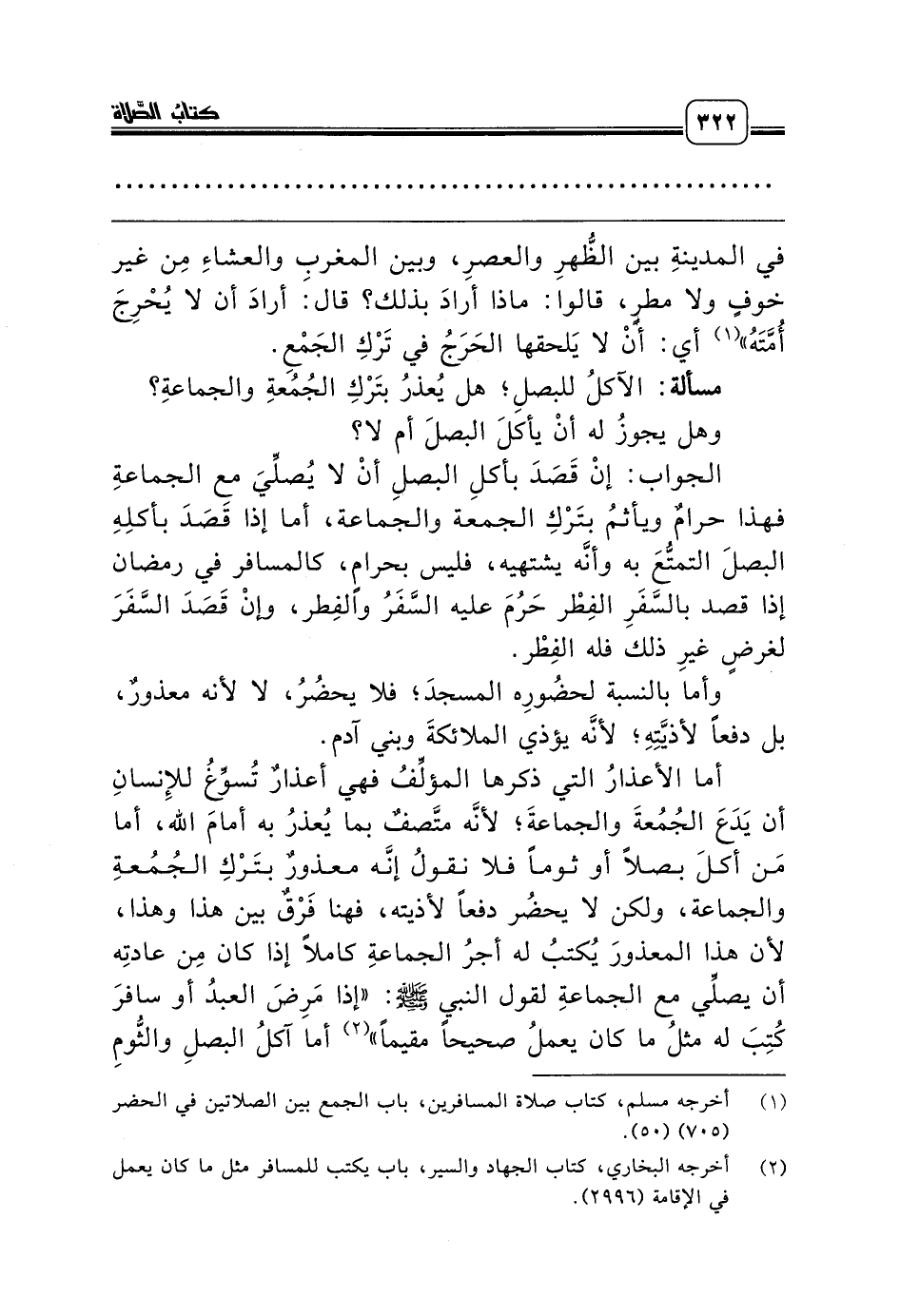 أما الأعذارُ التي ذكرها المؤلِّفُ فهي أعذارٌ تُسوِّغُ للإِنسانِ أن يَدَعَ الجُمُعةَ والجماعةَ؛ لأنَّه متَّصفٌ بما يُعذرُ به أمامَ الله، أما مَن أكلَ بصلاً أو ثوماً فلا نقولُ إنَّه معذورٌ بتَرْكِ الجُمُعةِ والجماعة، ولكن لا يحضُر دفعاً لأذيته، فهنا فَرْقٌ بين هذا وهذا، لأن هذا المعذورَ يُكتبُ له أجرُ الجماعةِ كاملاً إذا كان مِن عادتِه أن يصلِّي مع الجماعةِ لقول النبي صلّى الله عليه وسلّم: «إذا مَرِضَ العبدُ أو سافرَ كُتِبَ له مثلُ ما كان يعملُ صحيحاً مقيماً» (¬2) أما آكلُ البصلِ والثُّومِ