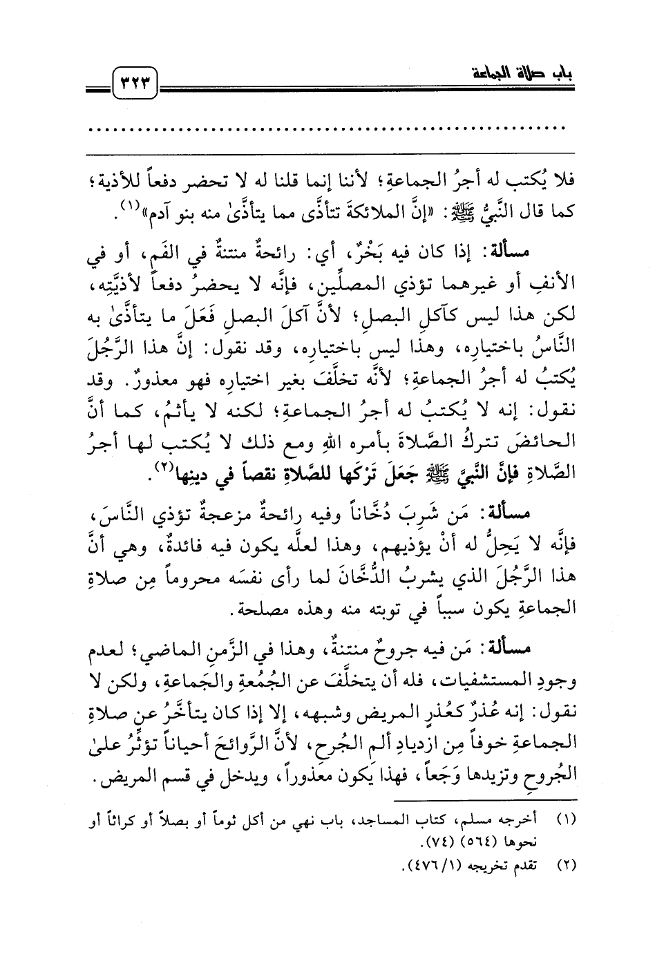 مسألة: إذا كان فيه بَخْرٌ، أي: رائحةٌ منتنةٌ في الفَمِ، أو في الأنفِ أو غيرهما تؤذي المصلِّين، فإنَّه لا يحضرُ دفعاً لأذيَّتِه، لكن هذا ليس كآكلِ البصلِ؛ لأنَّ آكلَ البصلِ فَعَلَ ما يتأذَّى به النَّاسُ باختيارِه، وهذا ليس باختيارِه، وقد نقول: إنَّ هذا الرَّجُلَ يُكتبُ له أجرُ الجماعةِ؛ لأنَّه تخلَّفَ بغير اختيارِه فهو معذورٌ. وقد نقول: إنه لا يُكتبُ له أجرُ الجماعةِ؛ لكنه لا يأثمُ، كما أنَّ الحائضَ تتركُ الصَّلاةَ بأمره اللهِ ومع ذلك لا يُكتب لها أجرُ الصَّلاةِ فإنَّ النَّبيَّ صلّى الله عليه وسلّم جَعَلَ تَرْكَها للصَّلاةِ نقصاً في دينِها (¬2).