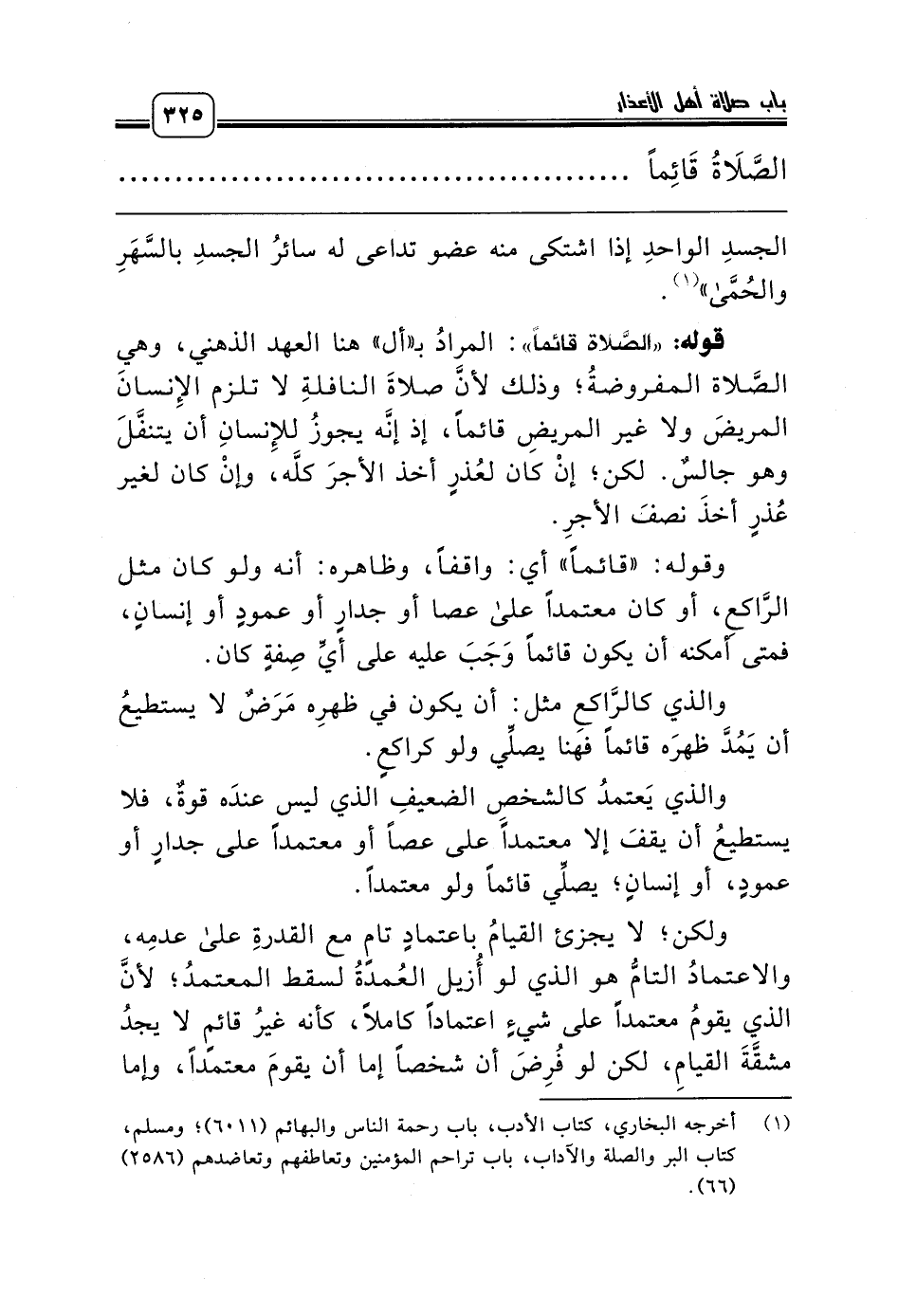 قوله: «الصَّلاة قائماً»: المرادُ بـ «أل» هنا العهد الذهني، وهي الصَّلاة المفروضةُ؛ وذلك لأنَّ صلاةَ النافلةِ لا تلزم الإِنسانَ المريضَ ولا غير المريضِ قائماً، إذ إنَّه يجوزُ للإِنسانِ أن يتنفَّلَ وهو جالسٌ. لكن؛ إنْ كان لعُذرٍ أخذ الأجرَ كلَّه، وإنْ كان لغير عُذرٍ أخذَ نصفَ الأجرِ.