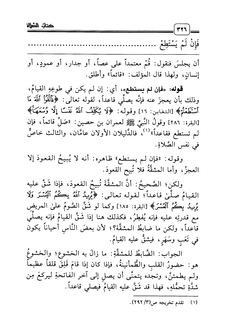 ولكن؛ الصَّحيحُ: أنَّ المشقَّةَ تُبيحُ القعودَ، فإذا شَقَّ عليه القيامُ صلَّى قاعداً؛ لقوله تعالى: {يُرِيدُ اللَّهُ بِكُمُ الْيُسْرَ وَلاَ يُرِيدُ بِكُمُ الْعُسْرَ} [البقرة: 185] وكما لو شَقَّ الصَّومُ على المريضِ مع قدرتِه عليه فإنه يُفطِرُ، فكذلك هنا إذا شَقَّ القيامُ فإنه يصلِّي قاعداً، ولكن ما ضابطُ المشقَّة؟؛ لأن بعضَ النَّاسِ أحياناً يكون في تَعَبٍ وسَهَرٍ، فيشقُّ عليه القيامُ.