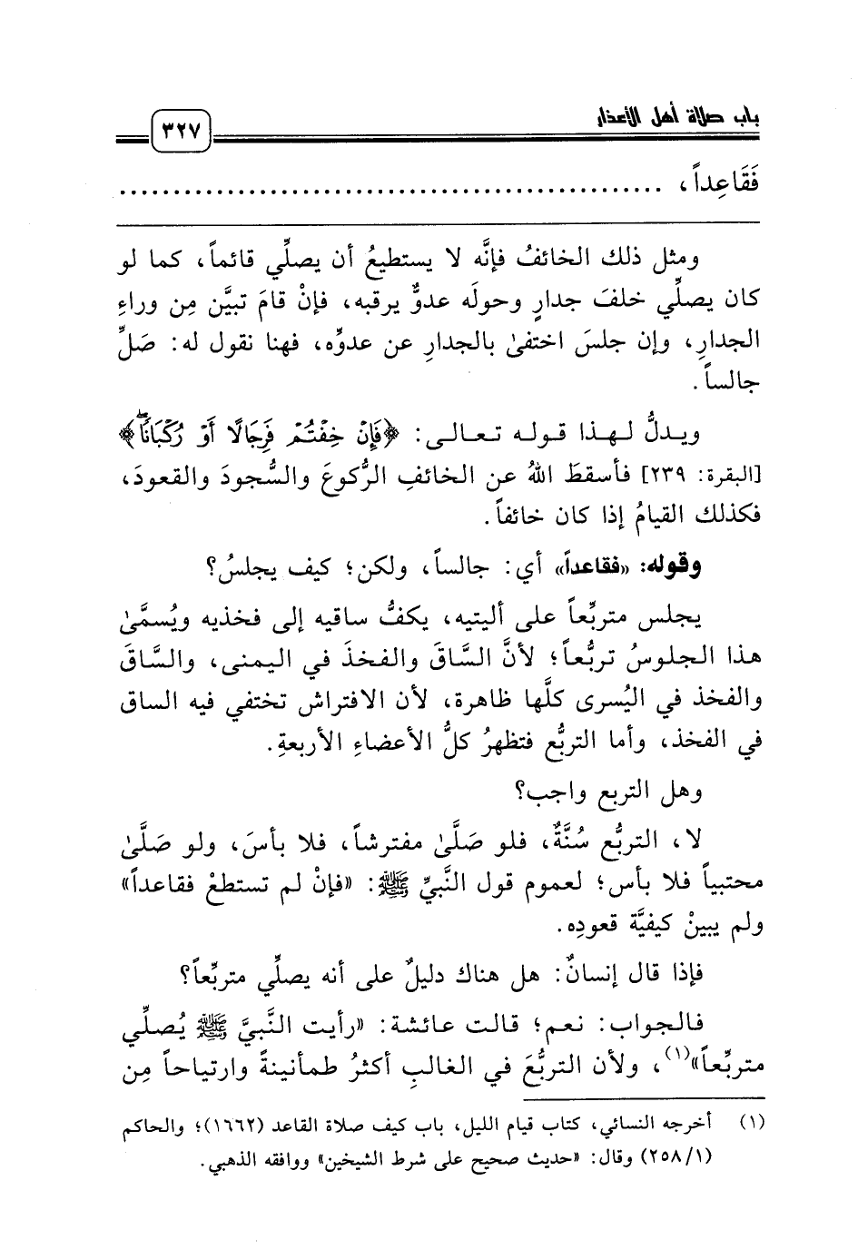 ومثل ذلك الخائفُ فإنَّه لا يستطيعُ أن يصلِّي قائماً، كما لو كان يصلِّي خلفَ جدارٍ وحولَه عدوٌّ يرقبه، فإنْ قامَ تبيَّن مِن وراءِ الجدارِ، وإن جلسَ اختفى بالجدارِ عن عدوِّه، فهنا نقول له: صَلِّ جالساً.
