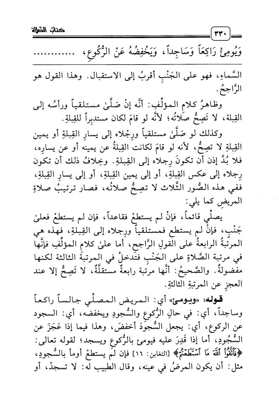 وظاهرُ كلامِ المؤلِّفِ: أنَّه إنْ صَلَّى مستلقياً ورأسُه إلى القِبلة، لا تَصِحُّ صلاتُه؛ لأنَّه لو قامَ لكان مستدبِراً للقِبلةِ.